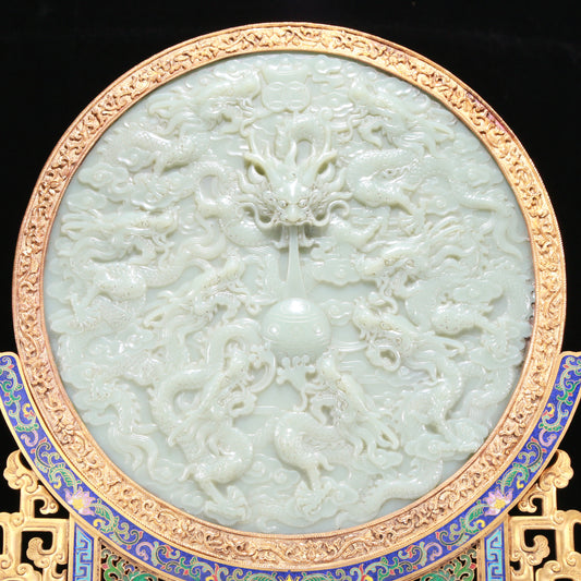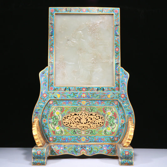 An Exquisite Cloisonne White Jade-Inlaid 'Dragon& Auspicious Cloud' Table Screen With Poem Inscriptions