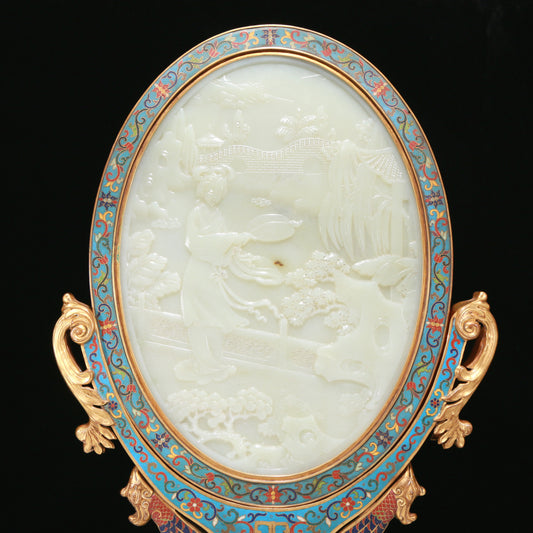An Exquisite Cloisonne White Jade-Inlaid 'Landscape& Figure' Table Screen With Imperial Poem Inscriptions From Qianlong Period
