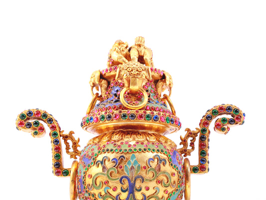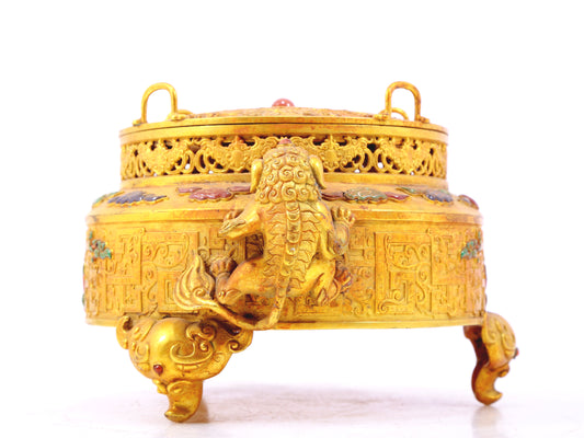 An exquisite gilt bronze censer with two ears and three legs inlaid with a hundred treasures, auspicious clouds and dragon and phoenix patterns, with a lid.