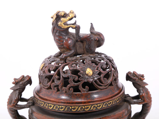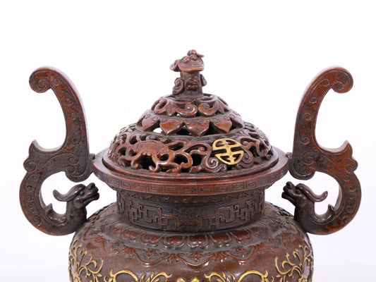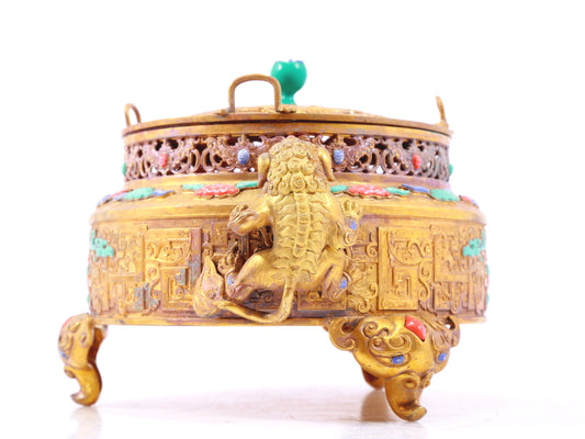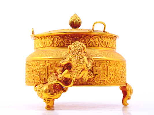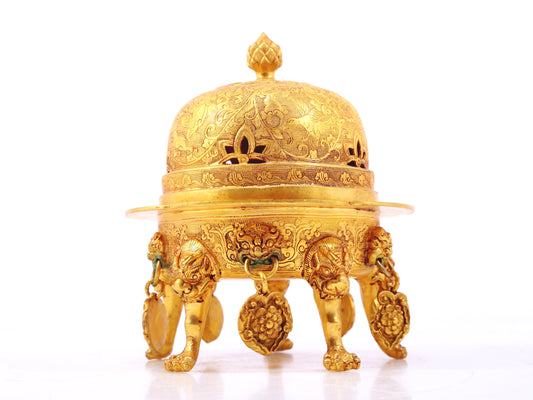An exquisite gilt bronze censer with lotus, auspicious and animal patterns and a lid