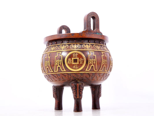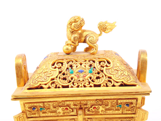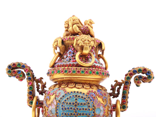 An exquisite gilt bronze censer with two ears and three legs inlaid with hundreds of treasures and lotus pattern, with a lid.