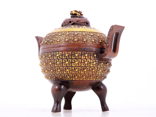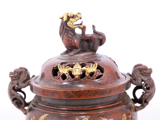 An exquisite gilt bronze double-eared and tripod censer with chilong pattern and lid