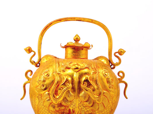 An exquisite gilt bronze ewer with lotus and dragon patterns wrapped around branches
