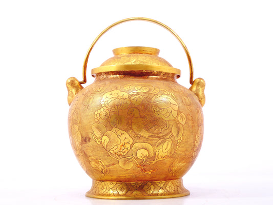 An exquisite gilt bronze jar with flower and bird patterns and lid