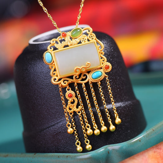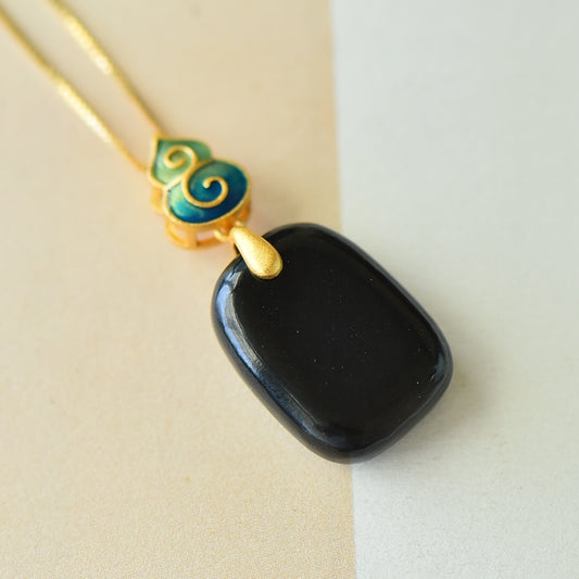 Gilt silver and Hetian ink jade enamel Ping An brand pendant