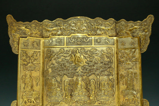 A Magnificent Gilt-Bronze 'Buddha Shakyamuni' Table Screen With Buddhist Sutra Scriptures On The Back