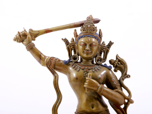 A majestic alloy copper inlaid silver statue of Manjusri Bodhisattva