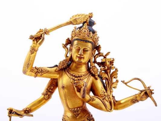 A majestic gilt bronze four-armed Manjushri statue with inscription