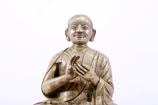 A majestic copper-silvered statue of the Guru