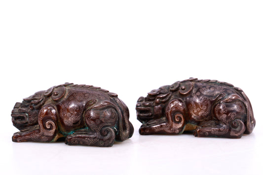 A Marvelous Pair Of Bronze Silver-Inlaid Auspicious Beasts