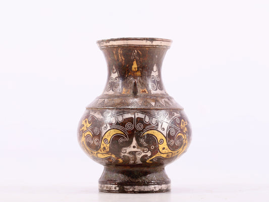 A pair of exquisite bronze amphora inlaid with gold and silver flowers and birds
