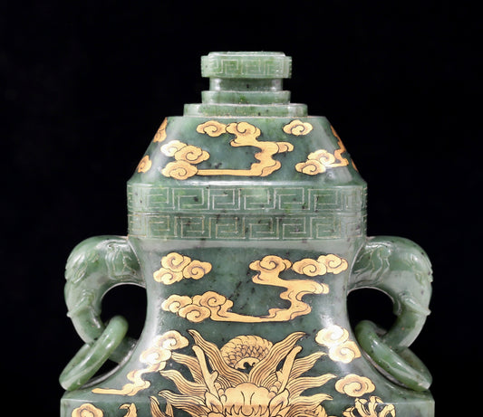 A perfect jasper bottle with golden dragon pattern and elephant ear cap