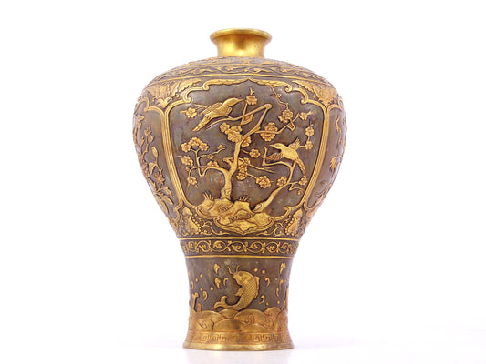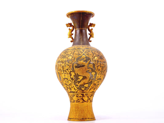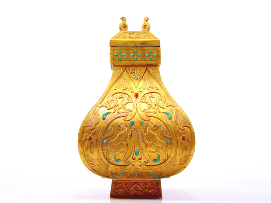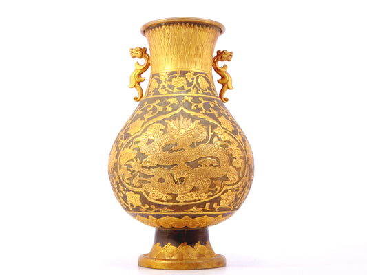 A perfect pair of gilt bronze amphora with lotus, auspicious and animal patterns