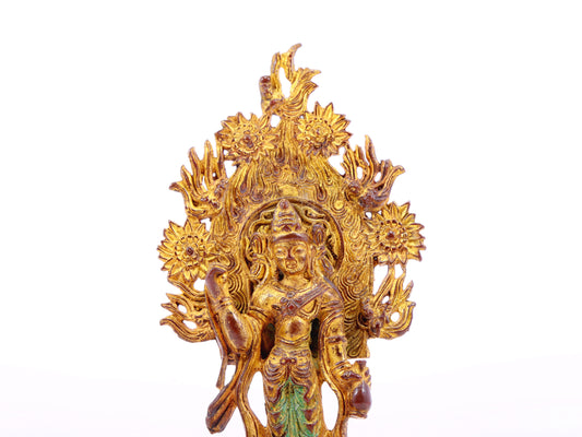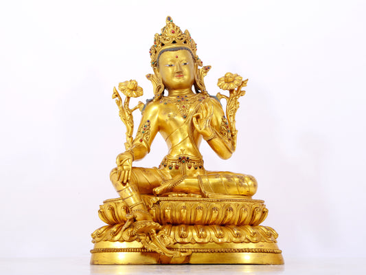 A serene gilt bronze statue of Tara inlaid with sapphire green