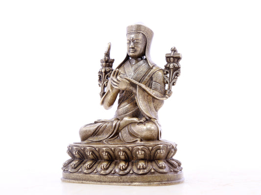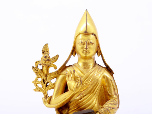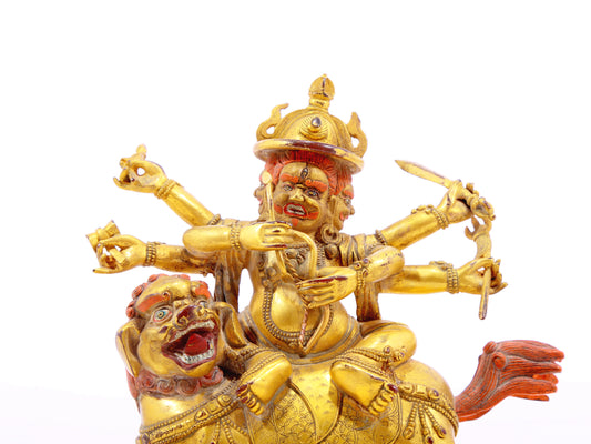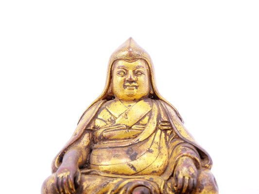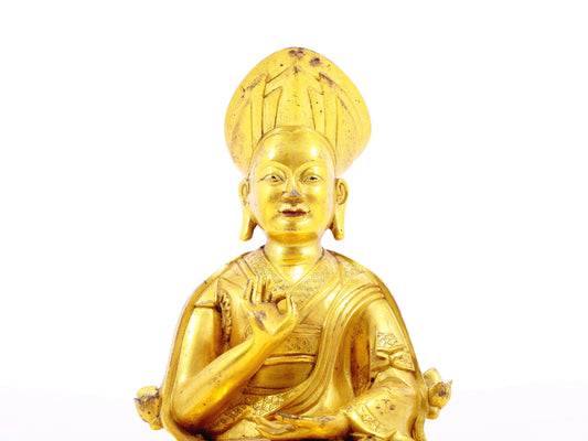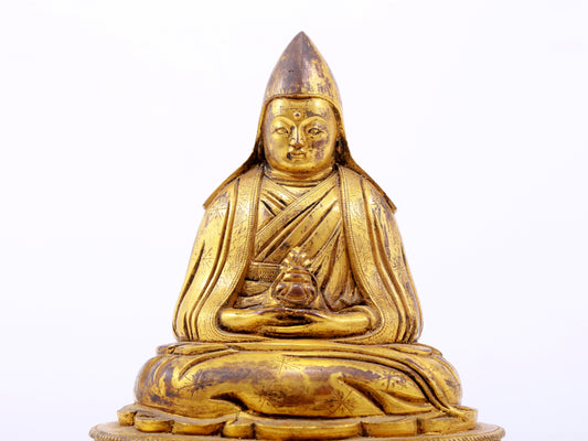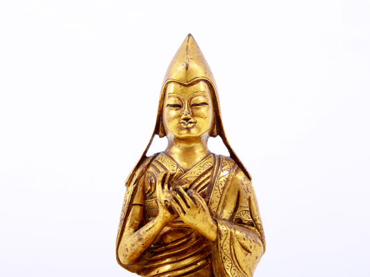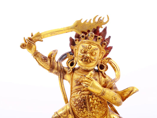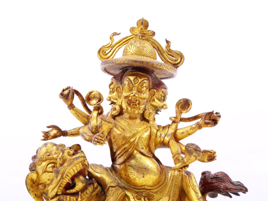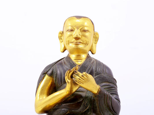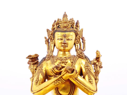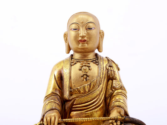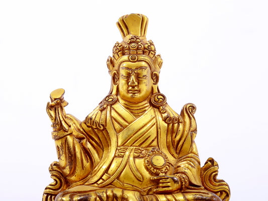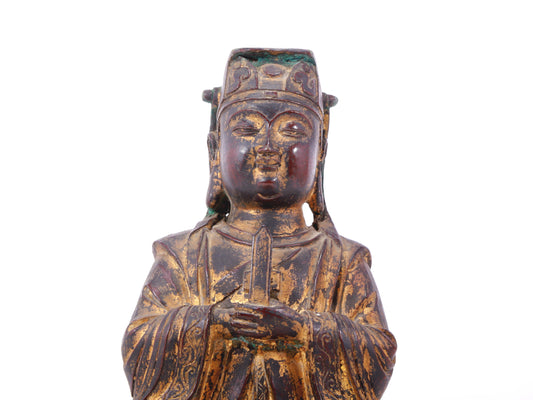 A serene gilt bronze statue of the Heavenly King inlaid with precious stones