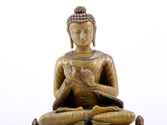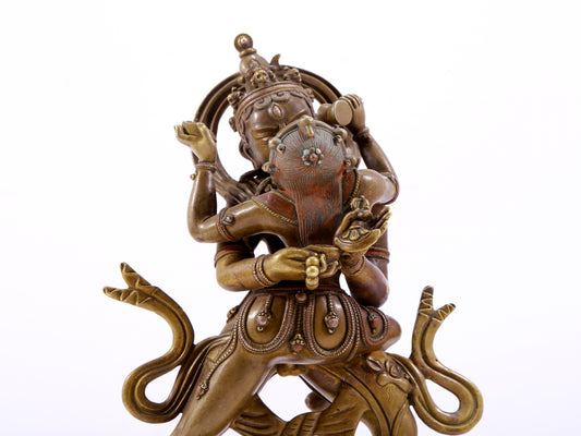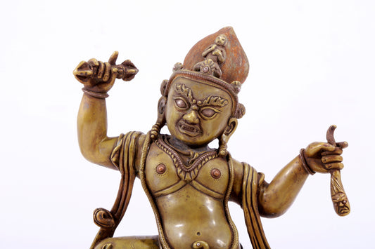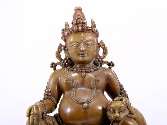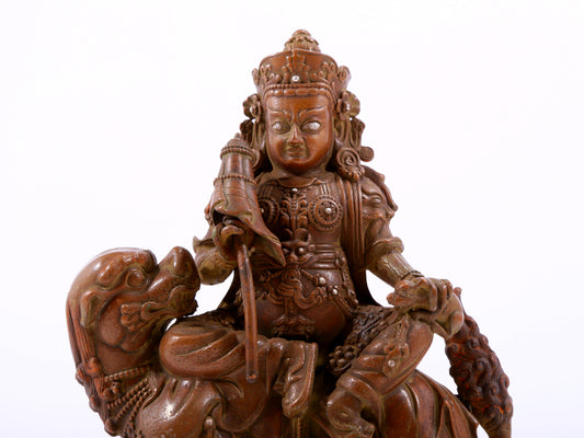 A solemn alloy copper inlaid silver statue of the God of Wealth riding a lion