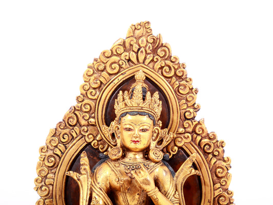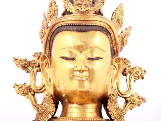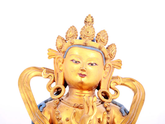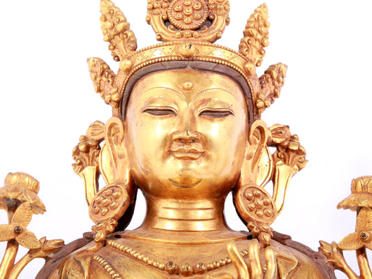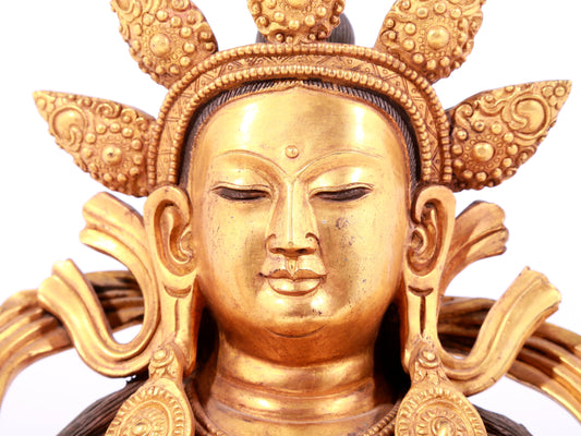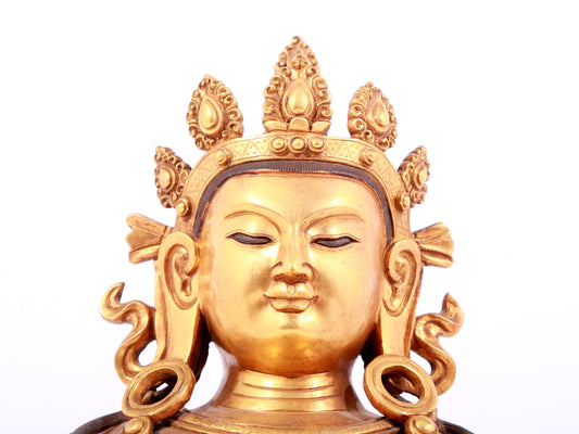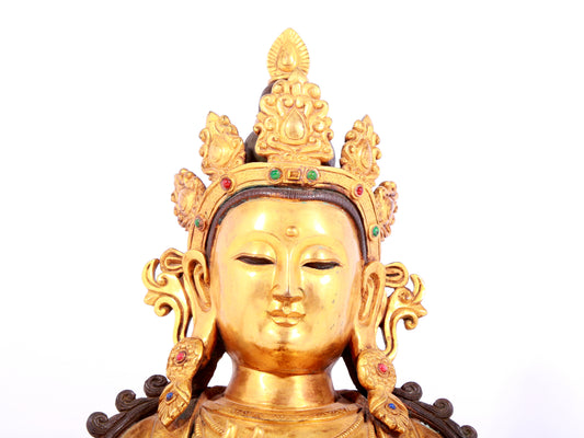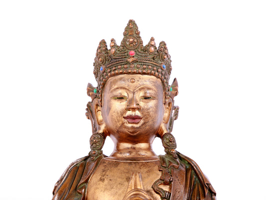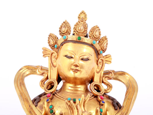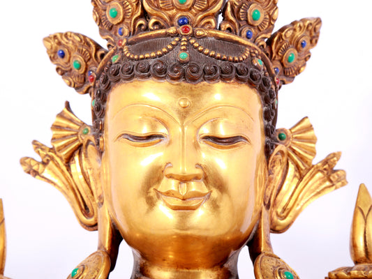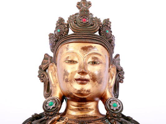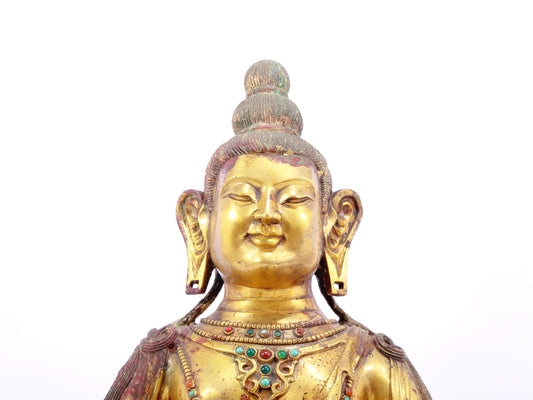 A solemn gilt bronze statue of Bodhisattva inlaid with precious stones