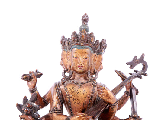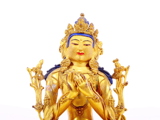 A solemn gilt bronze statue of Guanyin with four arms inlaid gems