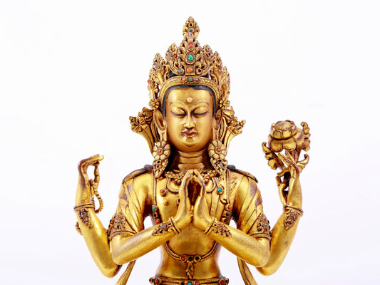 A solemn gilt bronze statue of Guanyin with four arms inlaid with hundreds of treasures