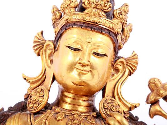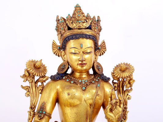 A solemn gilt copper inlaid turquoise green Tara statue