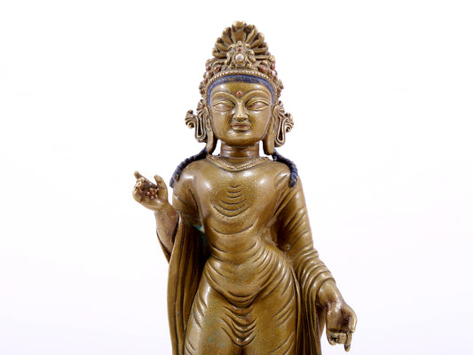 A solemn statue of Bodhisattva made of alloy copper and inlaid with silver