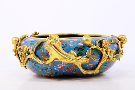 A delicate cloisonné 'Clouds and Bats' peach shaped brush washer