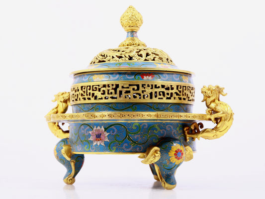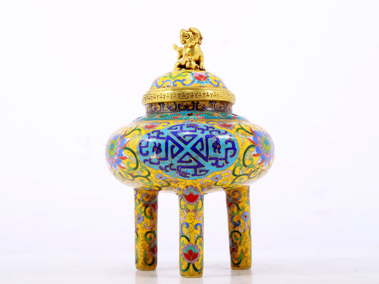 A cloisonné incense burner with two ears and three legs with lotus pattern