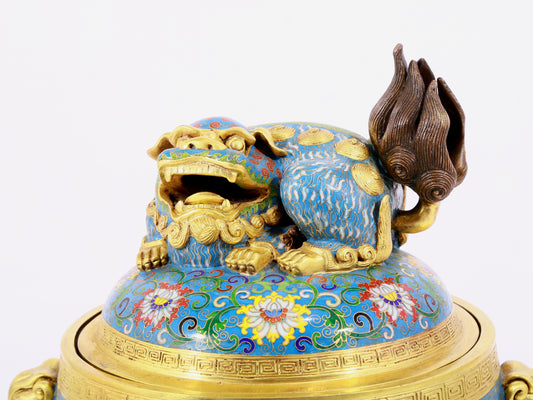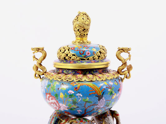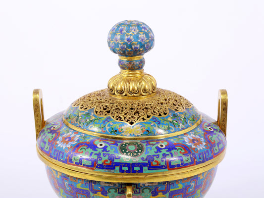 A fine cloisonné 'Lotus and animal mask' amphorae and tripod stove with lid