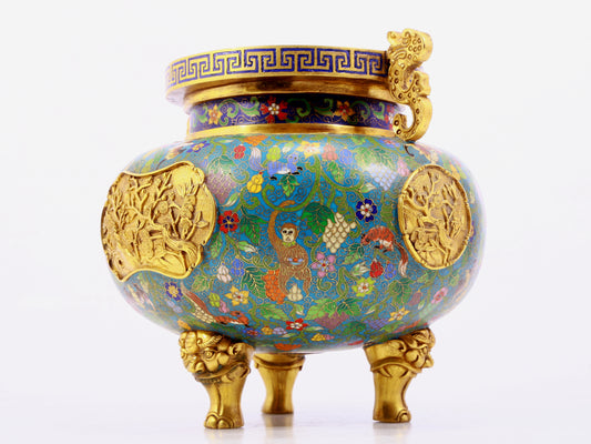 A cloisonne squirrel grape pattern two-eared three-legged incense burner