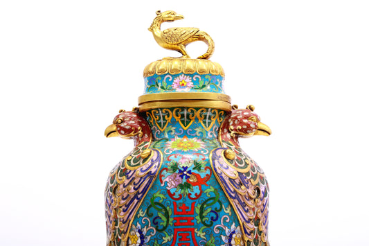 A Gorgeous Cloisonne 'Scrolling Lotus' Phoenix-Handled Vases