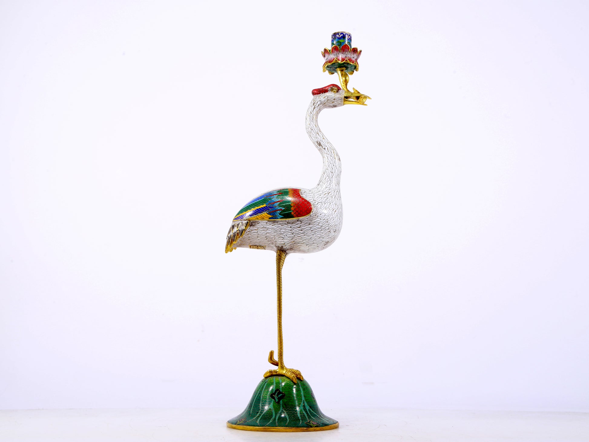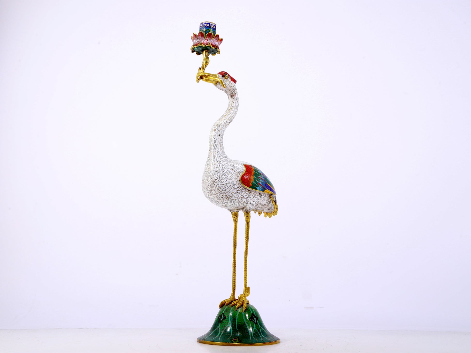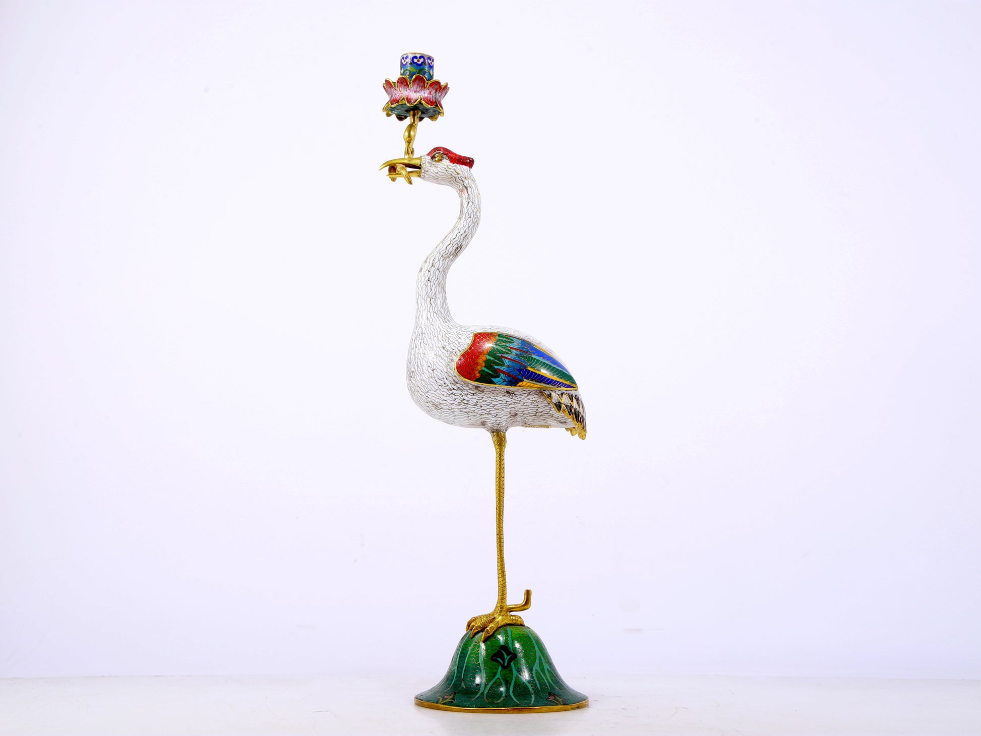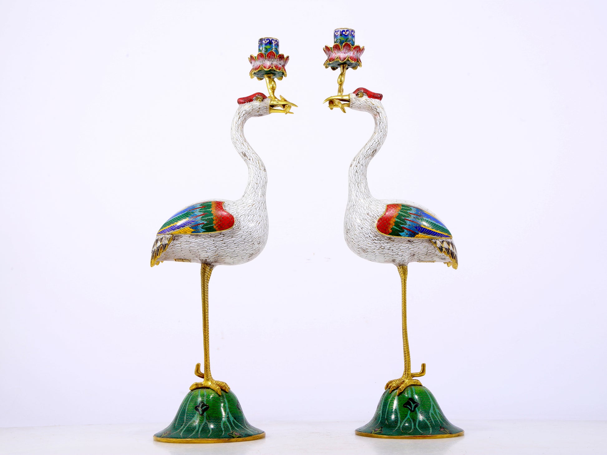 A pair of exquisite cloisonné crane-shaped candlesticks