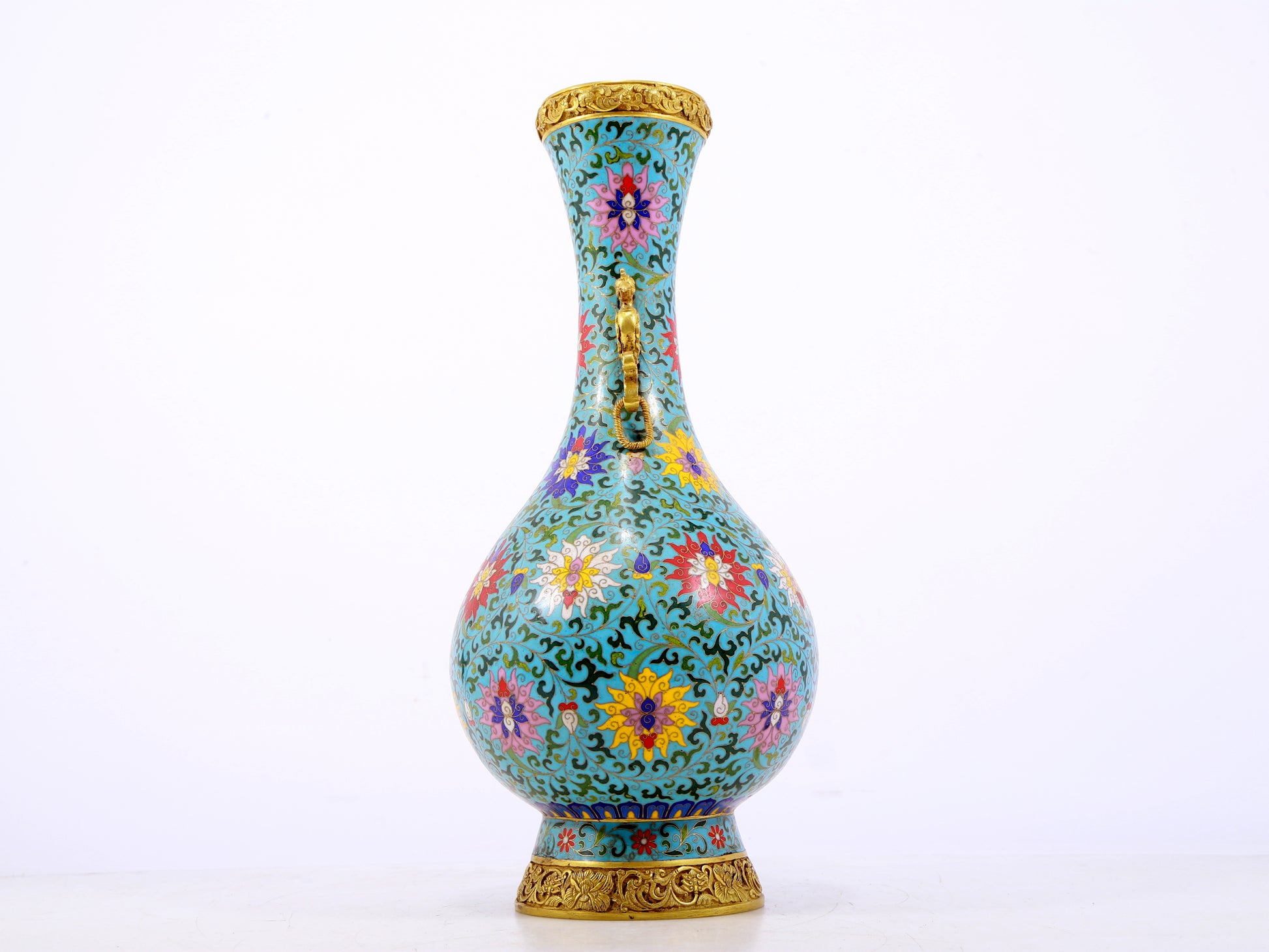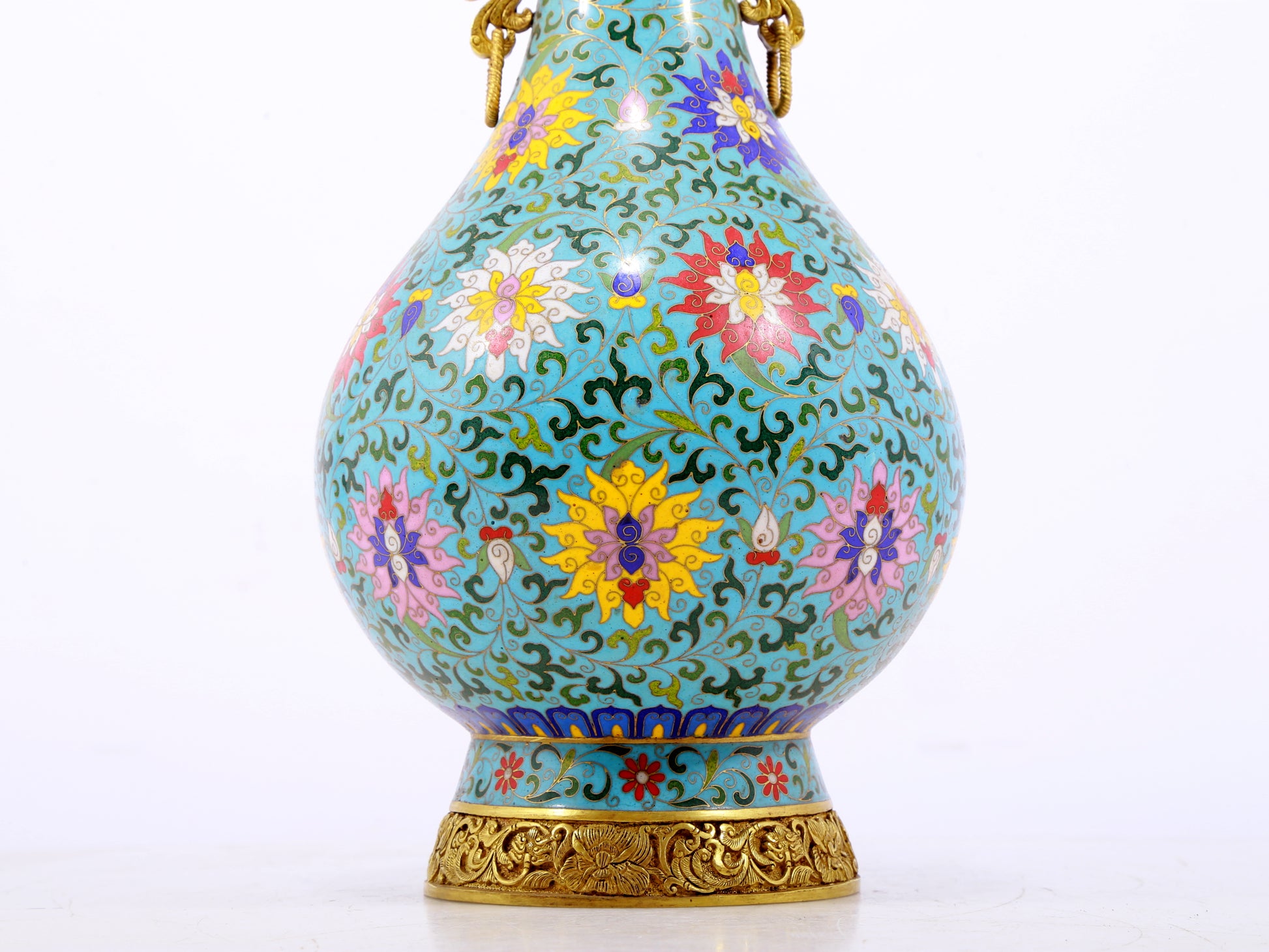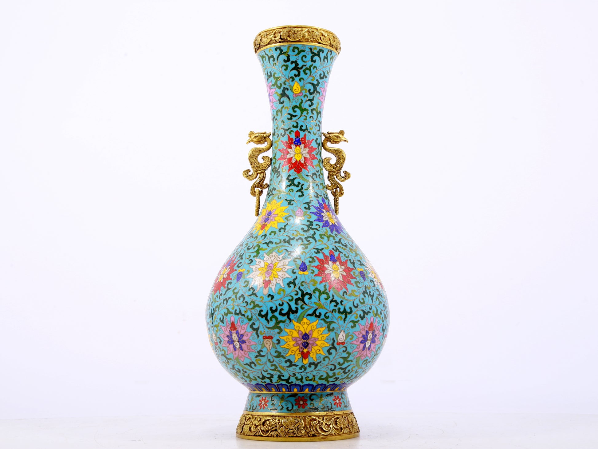 A pair of exquisite cloisonné phoenix-ear vases with entangled branches and lotus patterns