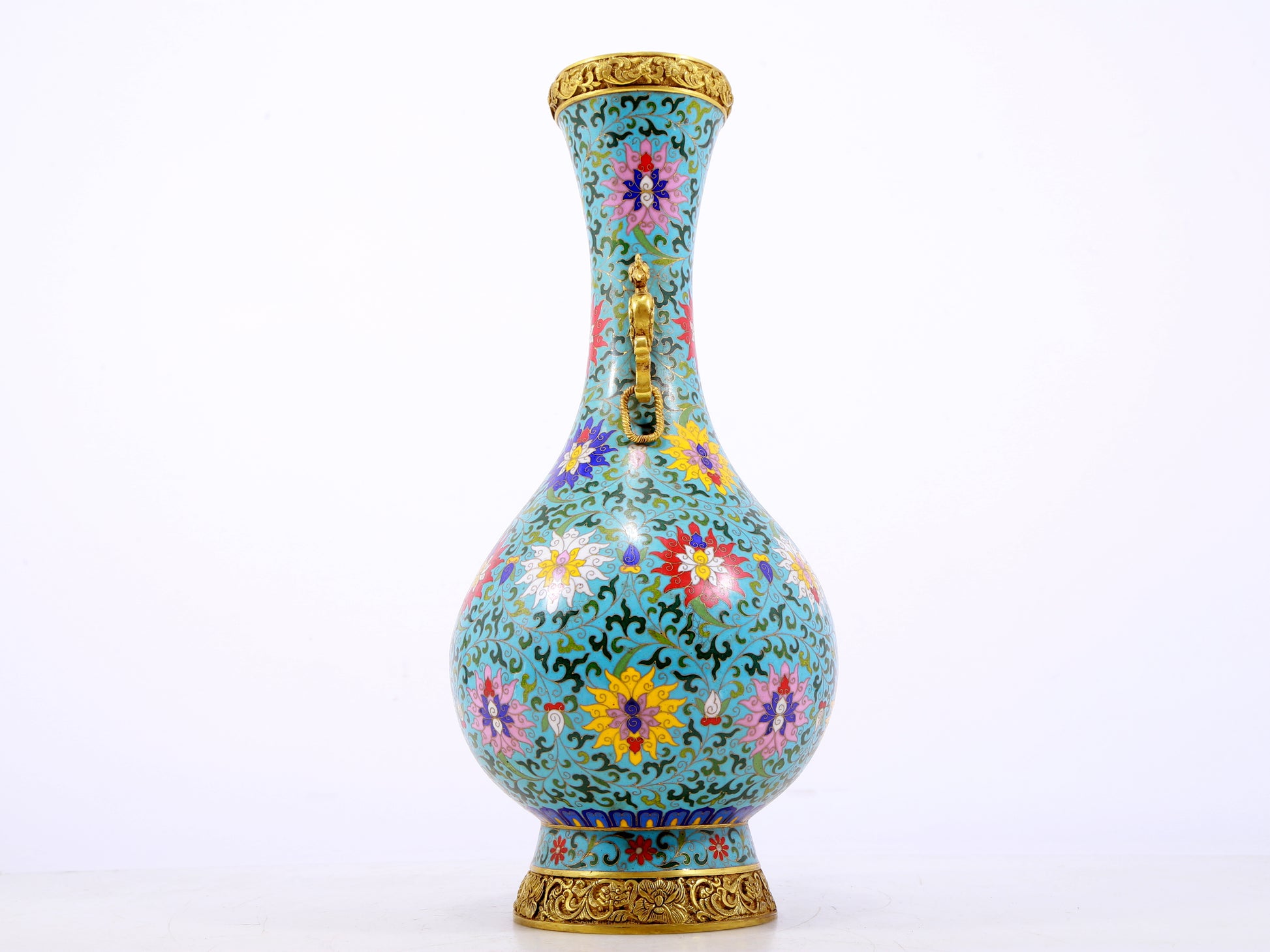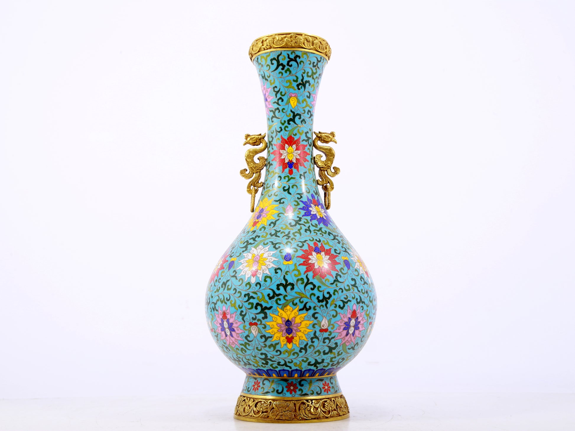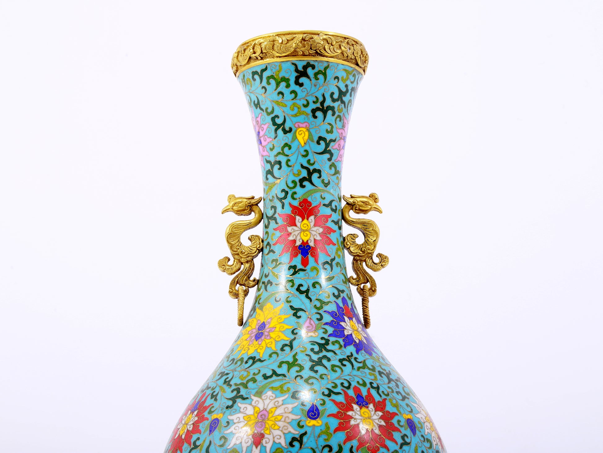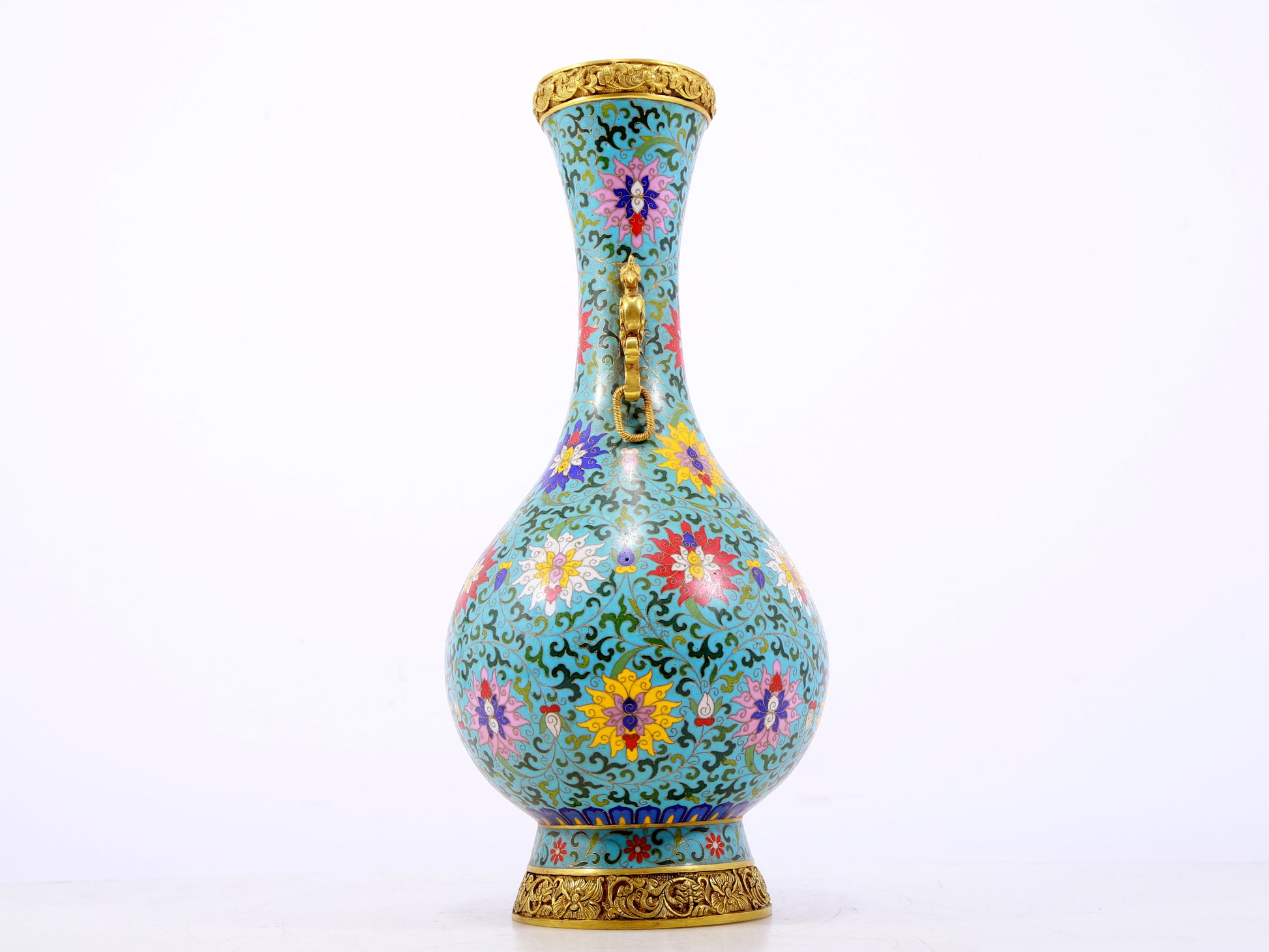 A pair of exquisite cloisonné phoenix-ear vases with entangled branches and lotus patterns