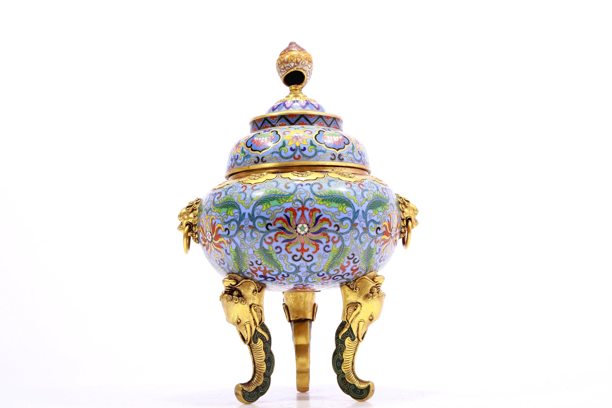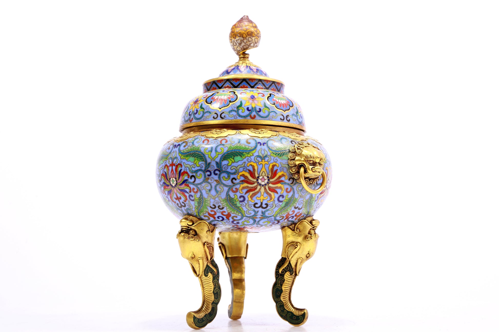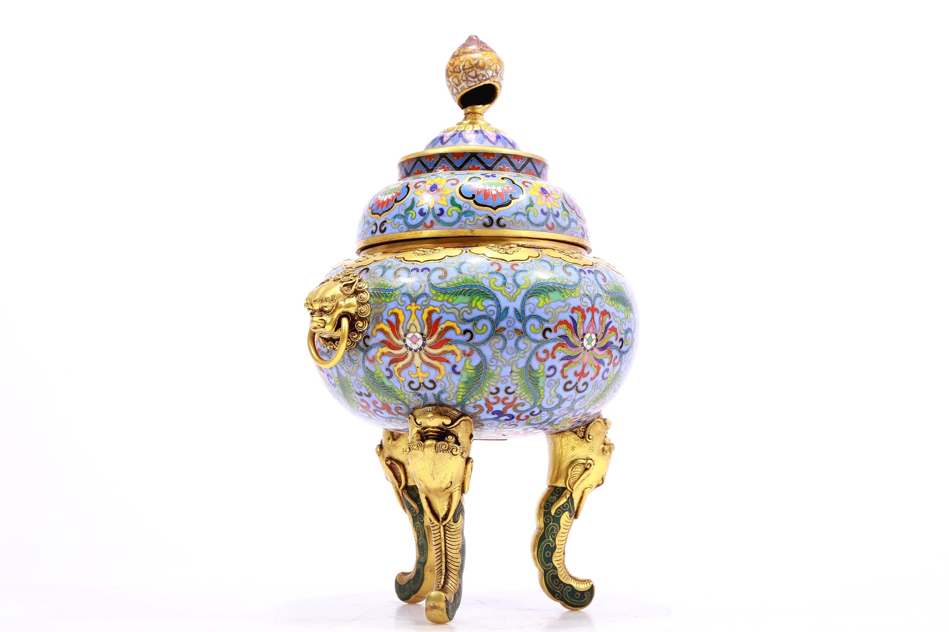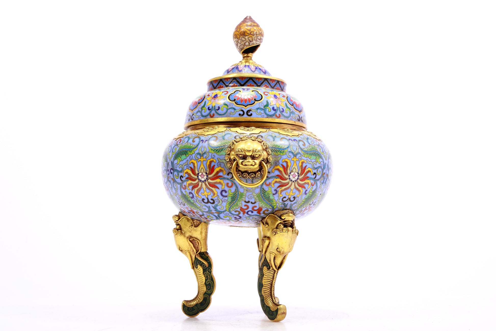 A Precious Cloisonne 'Scrolling Lotus' Lion-Handled Tripod Censer And Cover