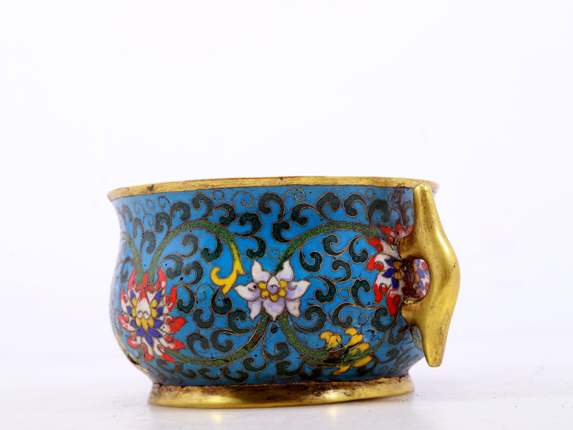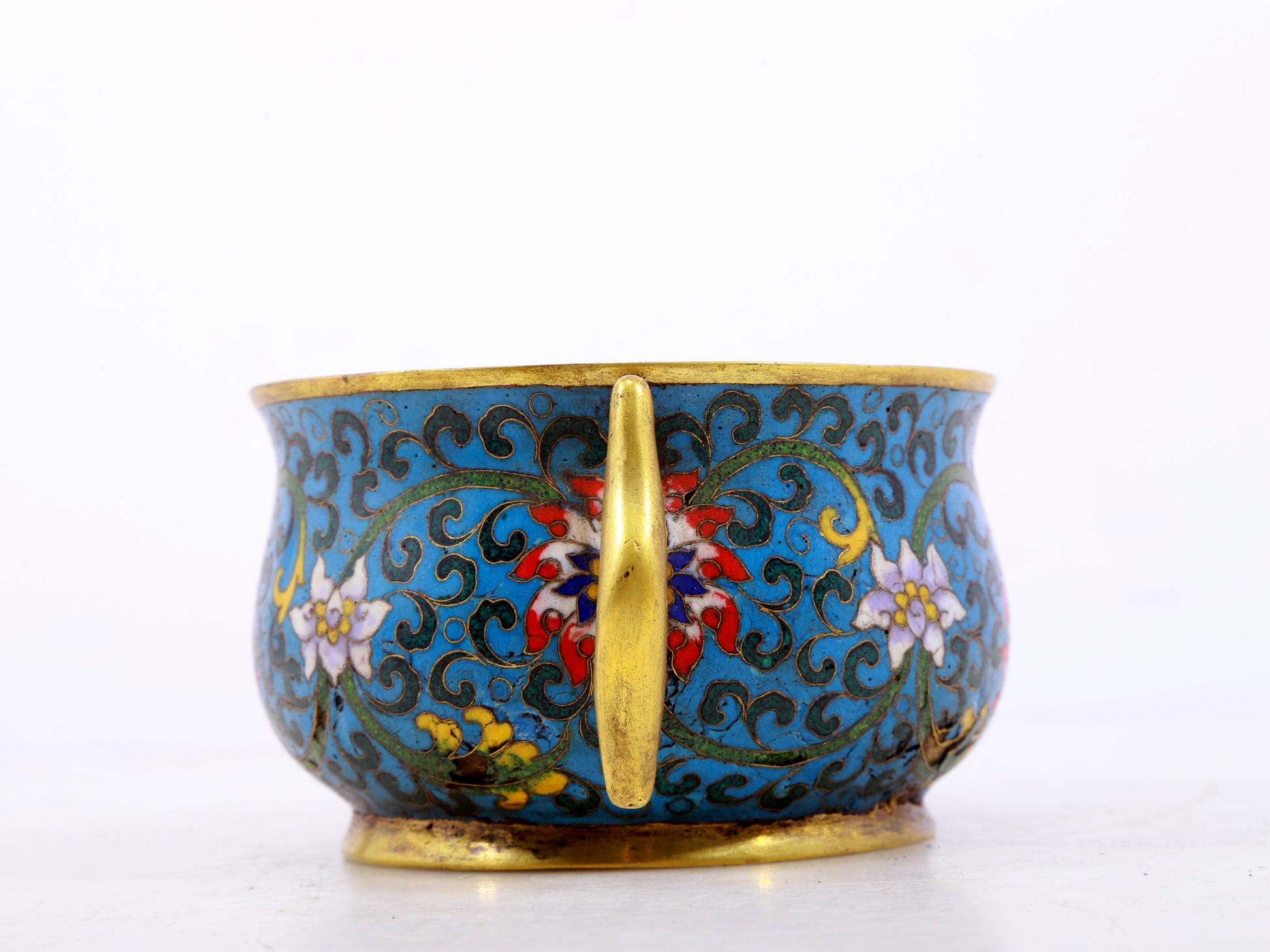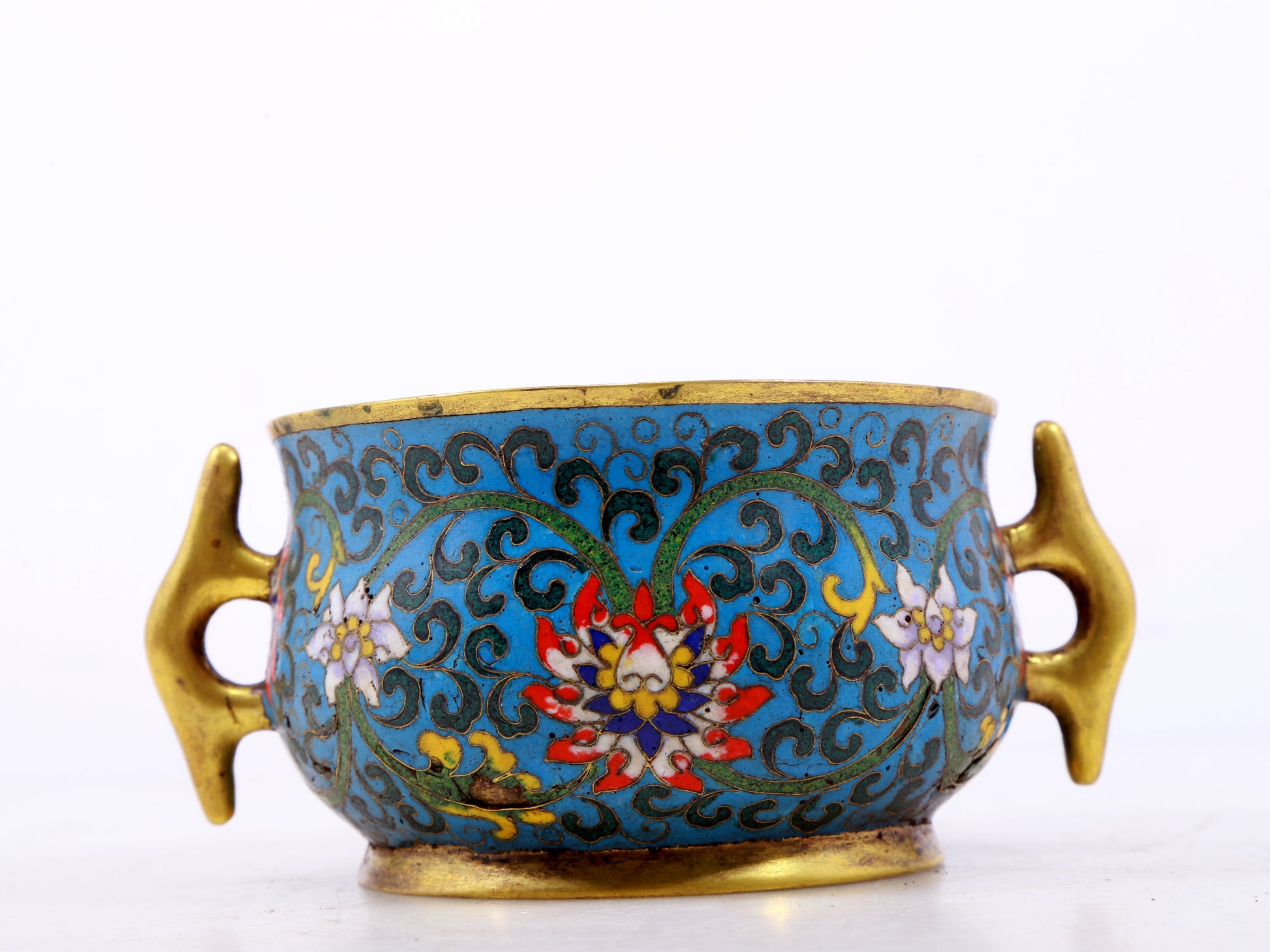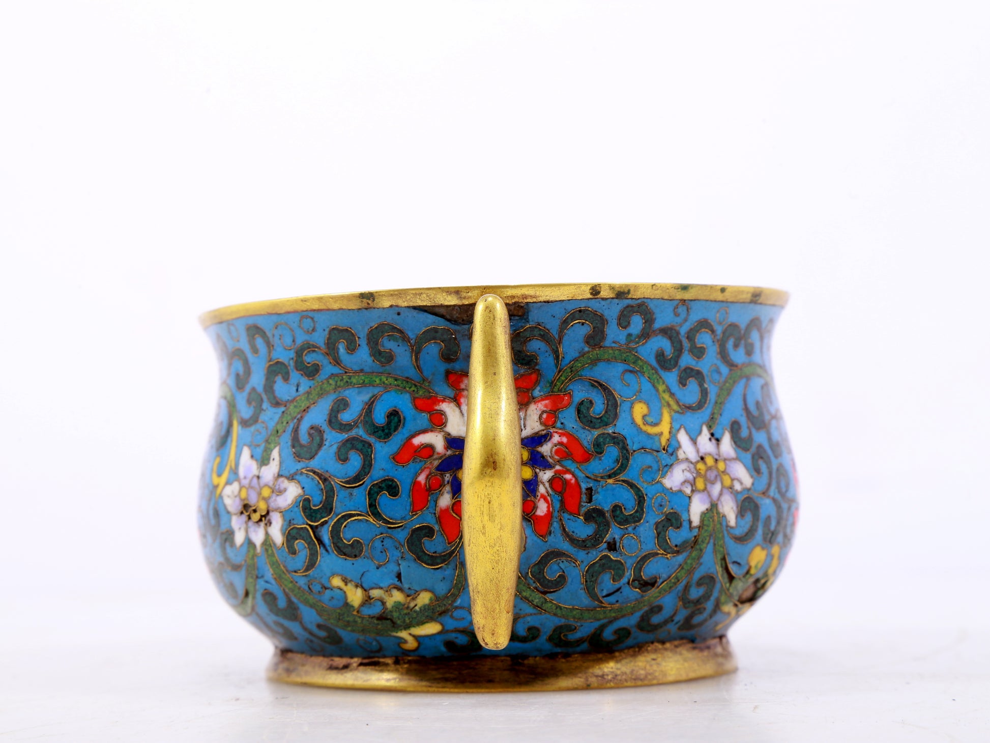 An exquisite cloisonné double-eared censer with twining lotus patterns