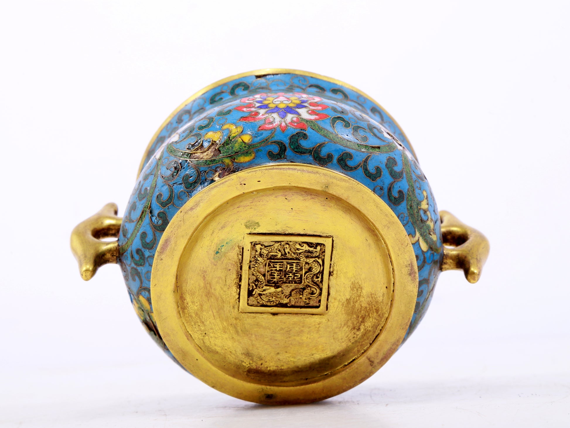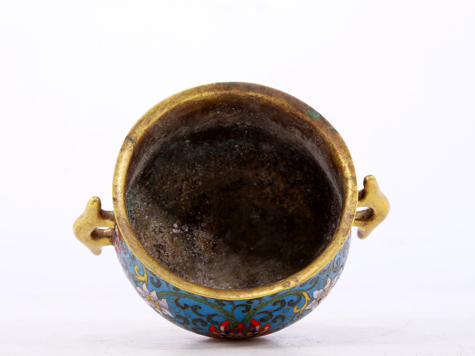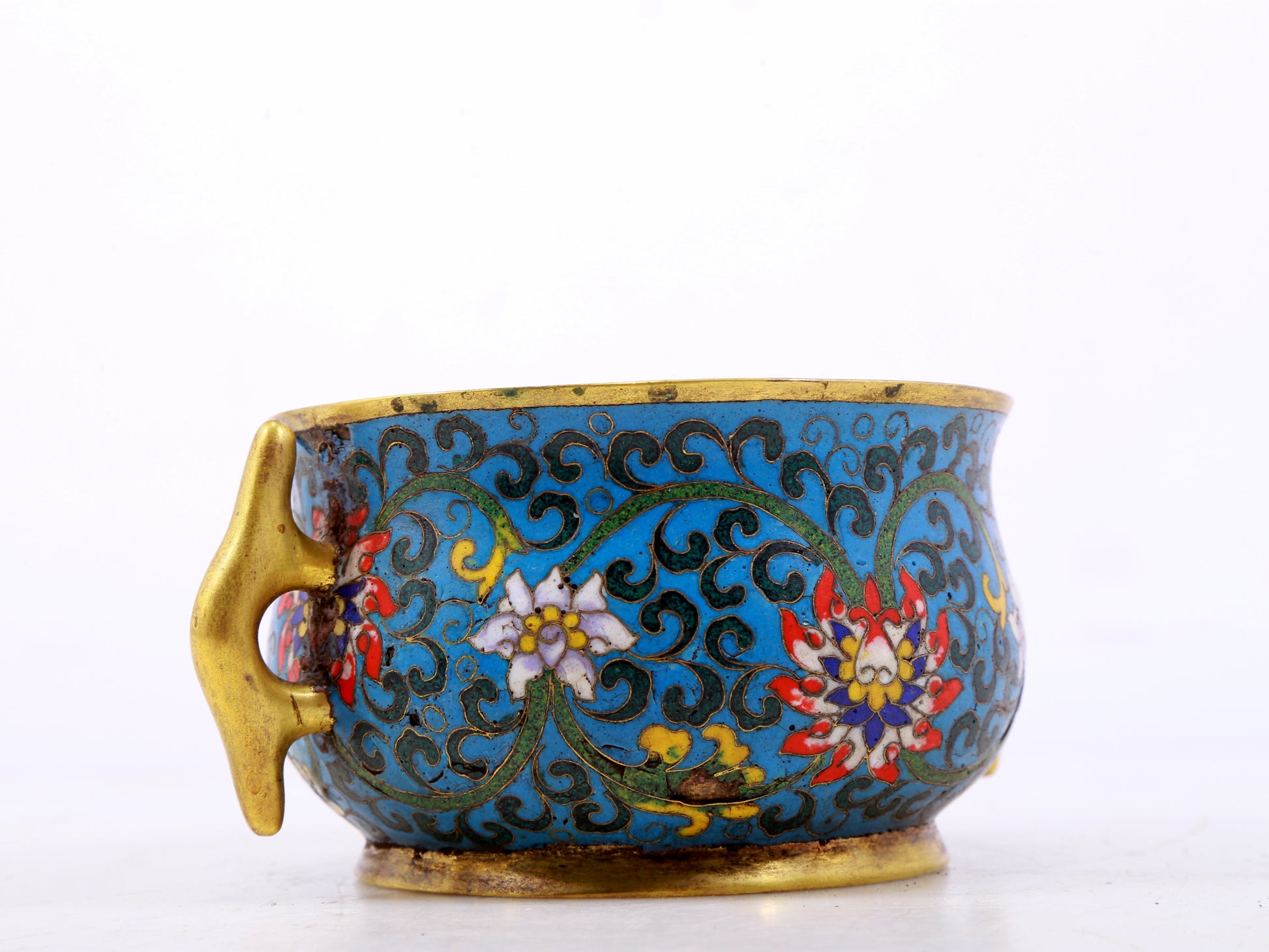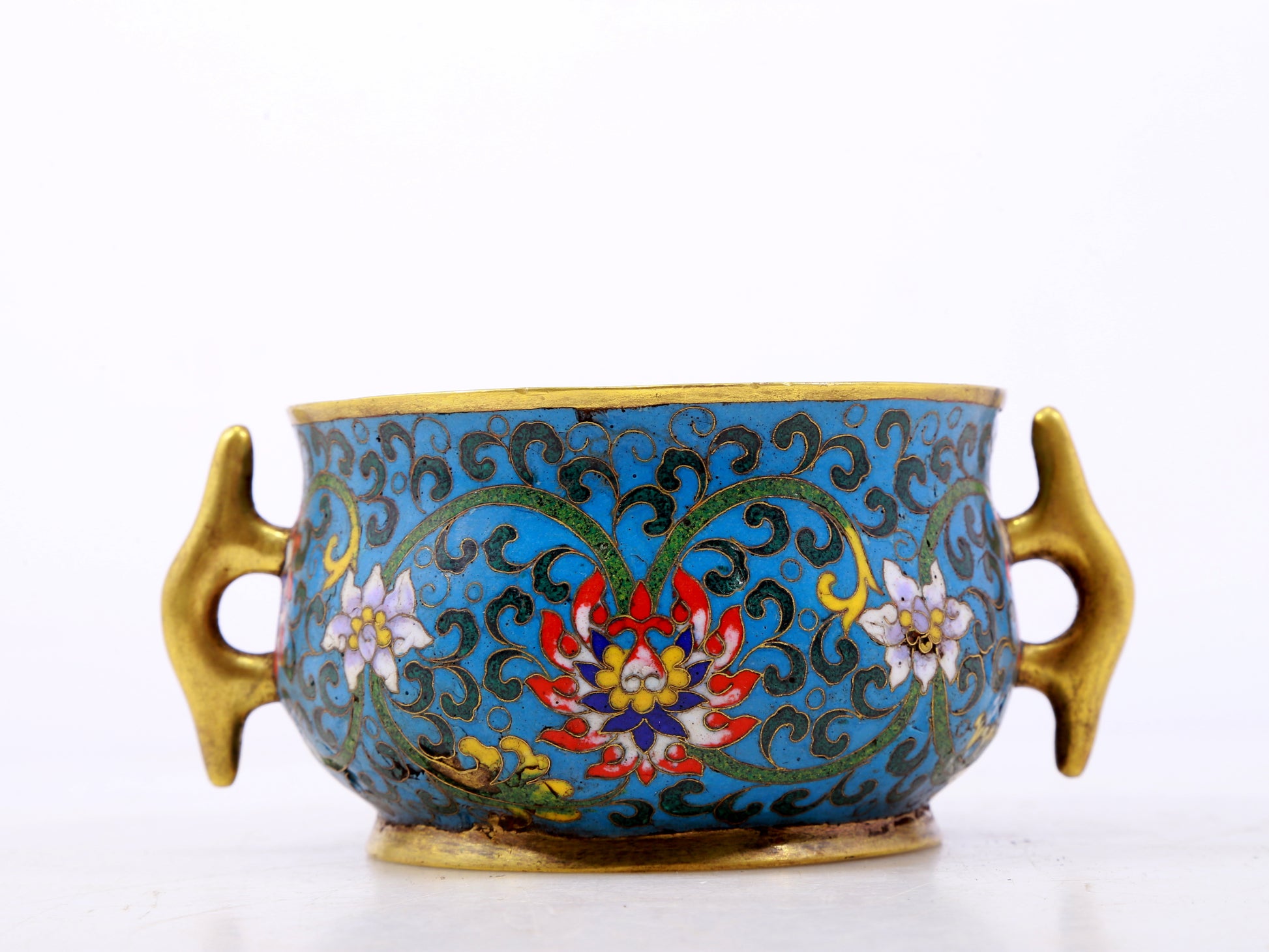 An exquisite cloisonné double-eared censer with twining lotus patterns