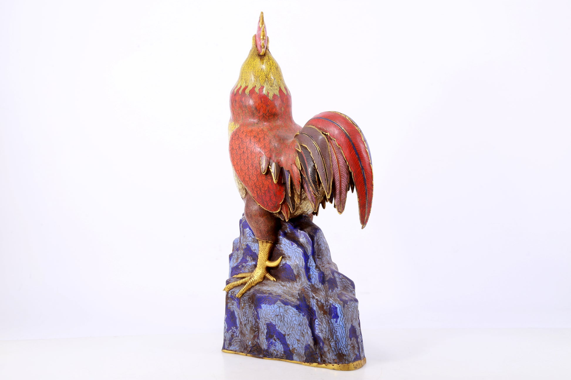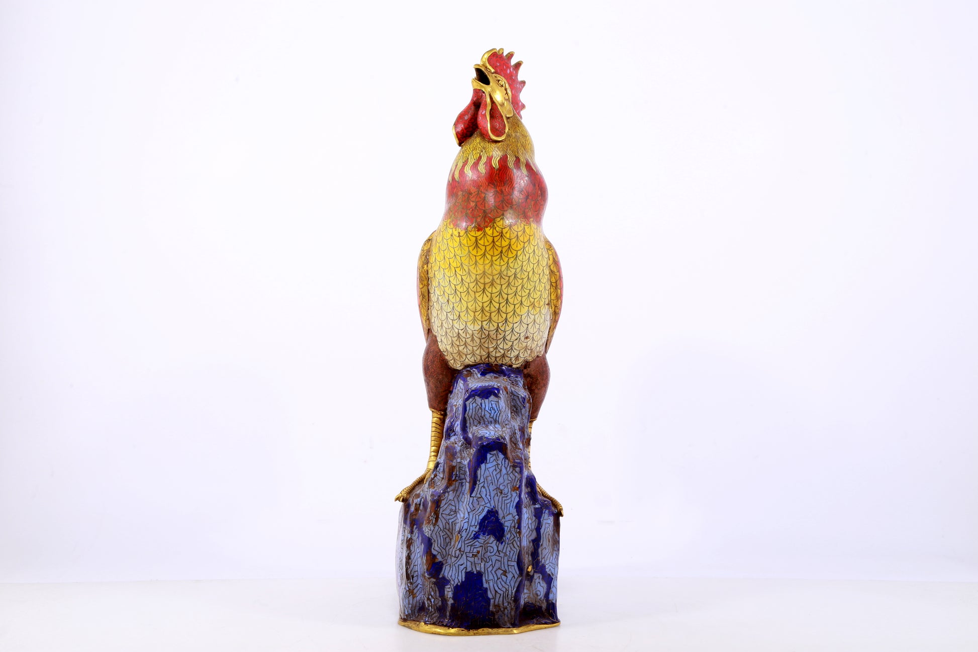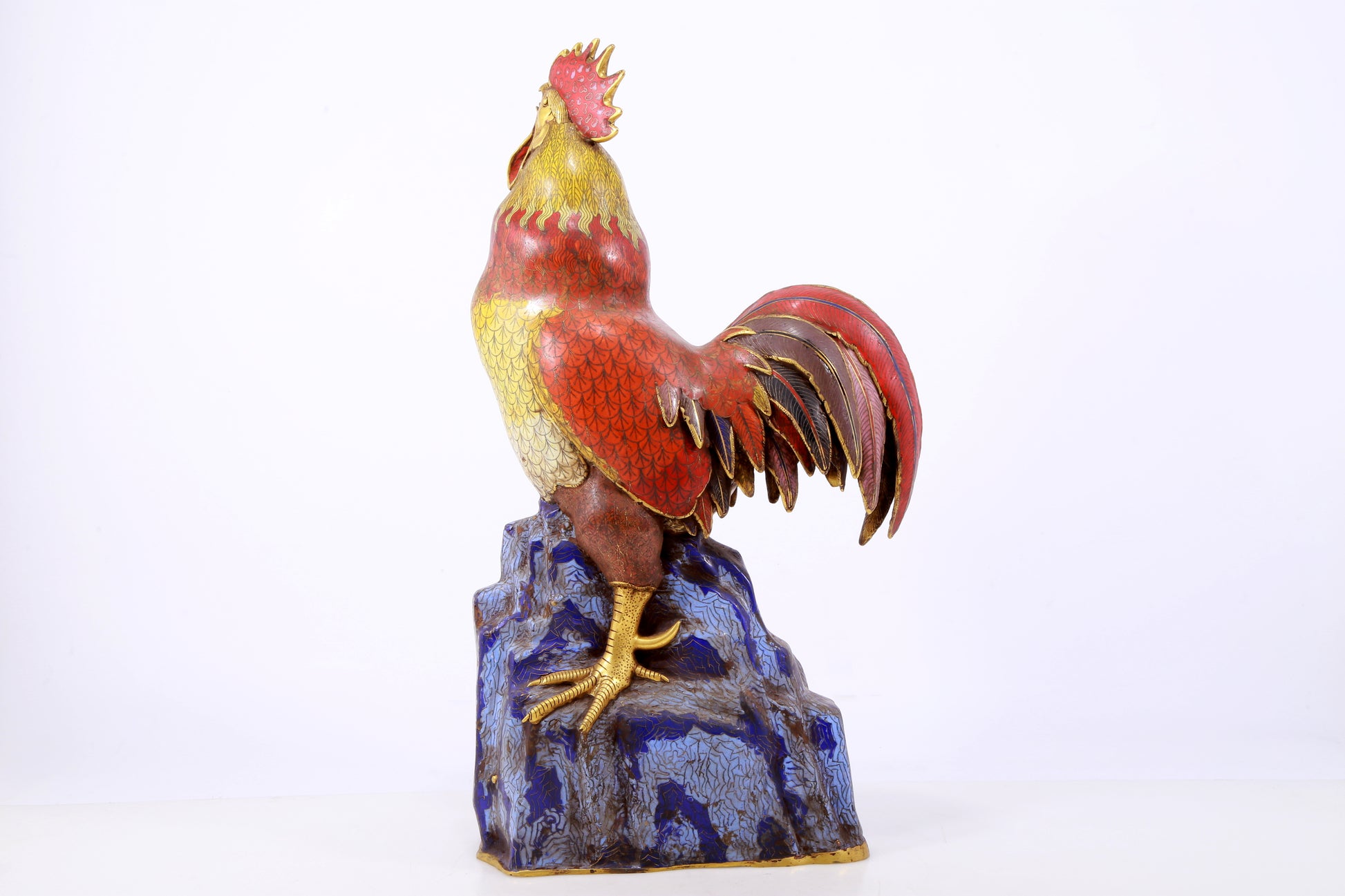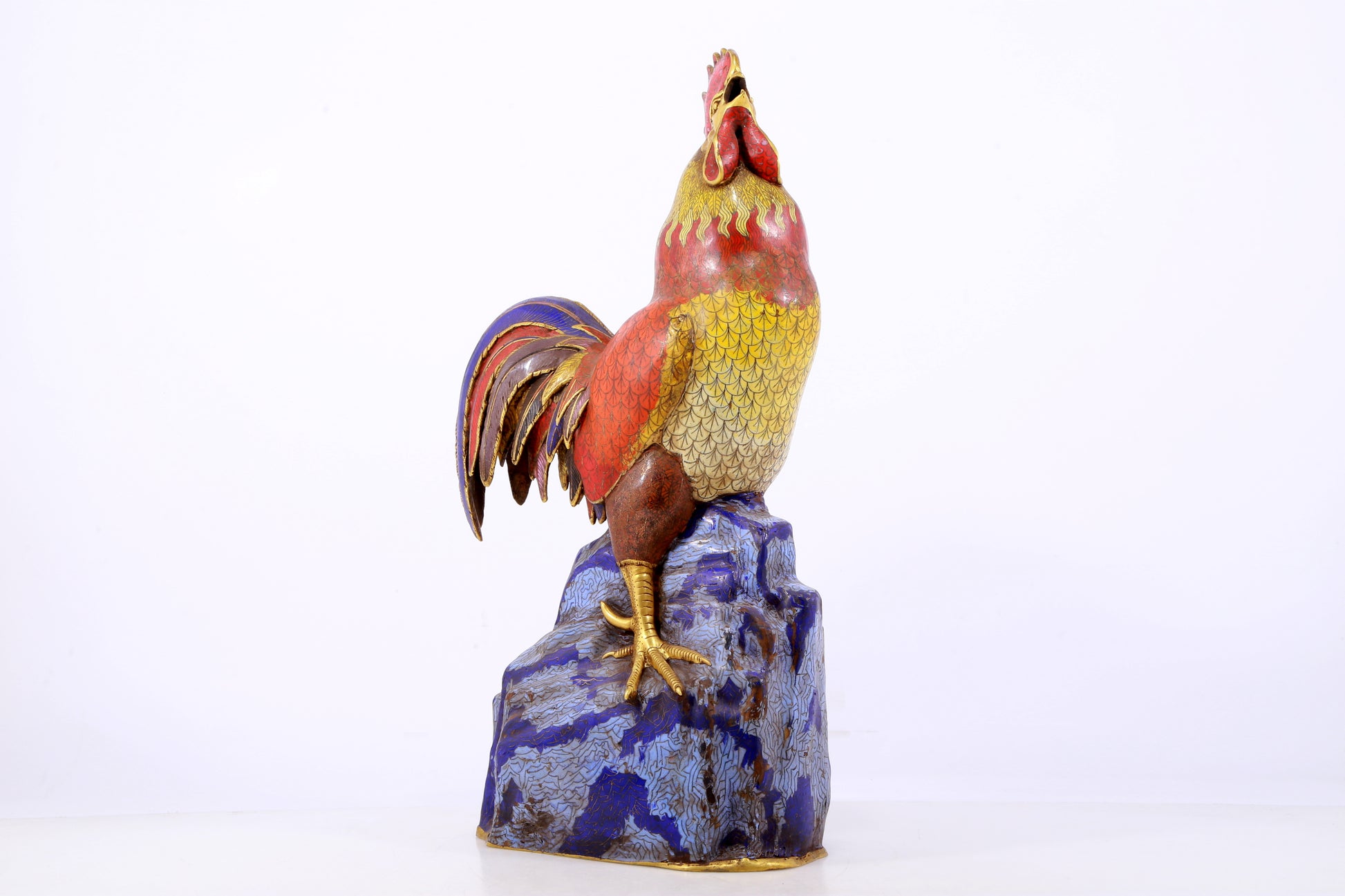 An exquisite cloisonné rooster ornament. The application of filigree technology makes the decoration of this collection more delicate and three-dimensional. This collectible is functional as well as decorative. In ancient China, due to the complex manufacturing process of cloisonne, the difficulty of glaze preparation and firing technology, and the high production cost, this precious enamel product was mainly produced in the palace for the enjoyment of the emperor and the royal family. This is not only a masterpiece of cloisonne craftsmanship, but also a perfect combination of art and craftsmanship. They have profound historical and cultural value, are often treasured and used as decorations, and represent the peak of Qing Dynasty craftsmanship. Qing Dynasty, China, Qianlong four-character mark, Size: 31cmx17cmx59cm, Weight: 12.23KG        景泰蓝公鸡摆件,中国清代,乾隆四字款