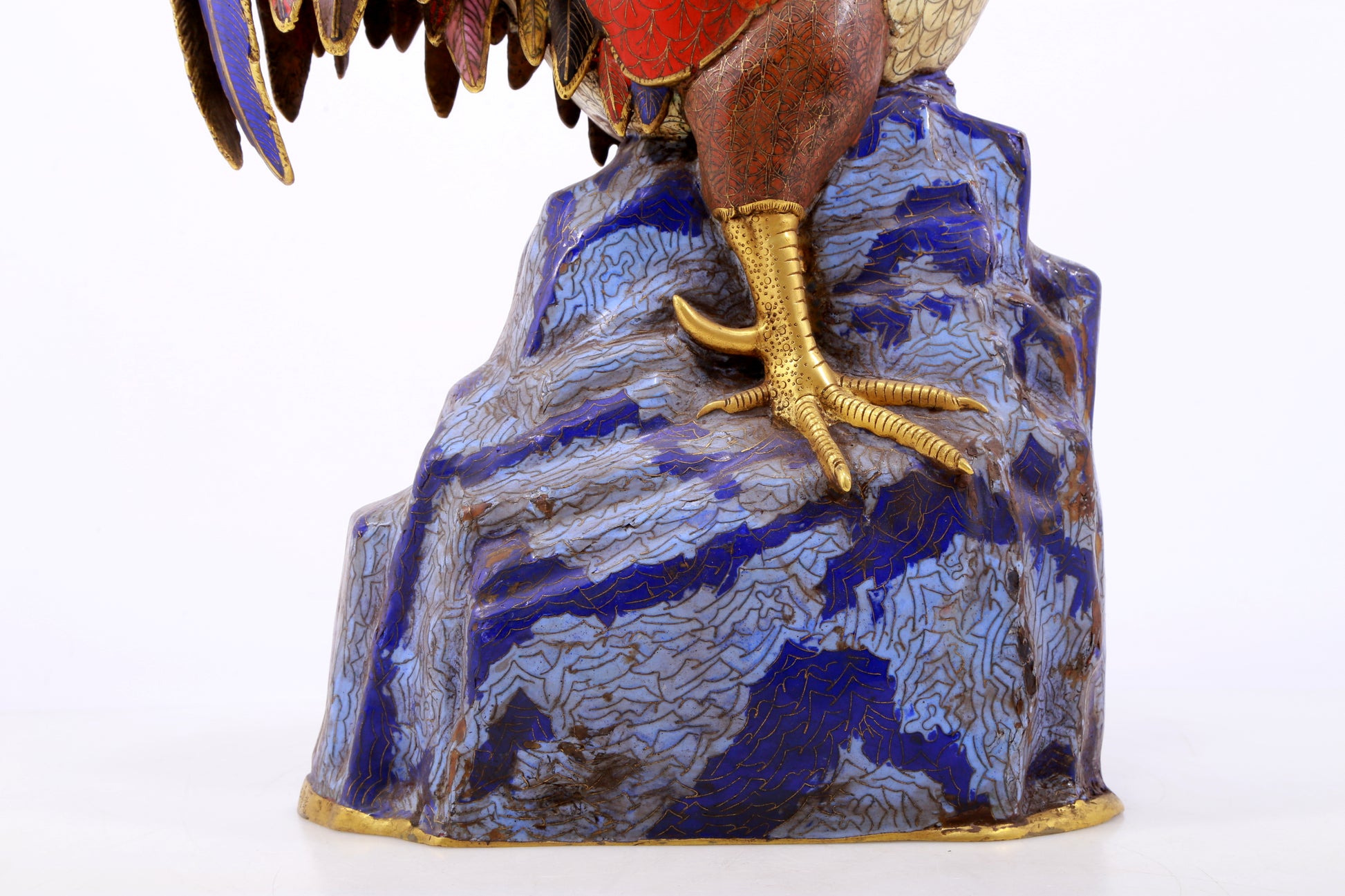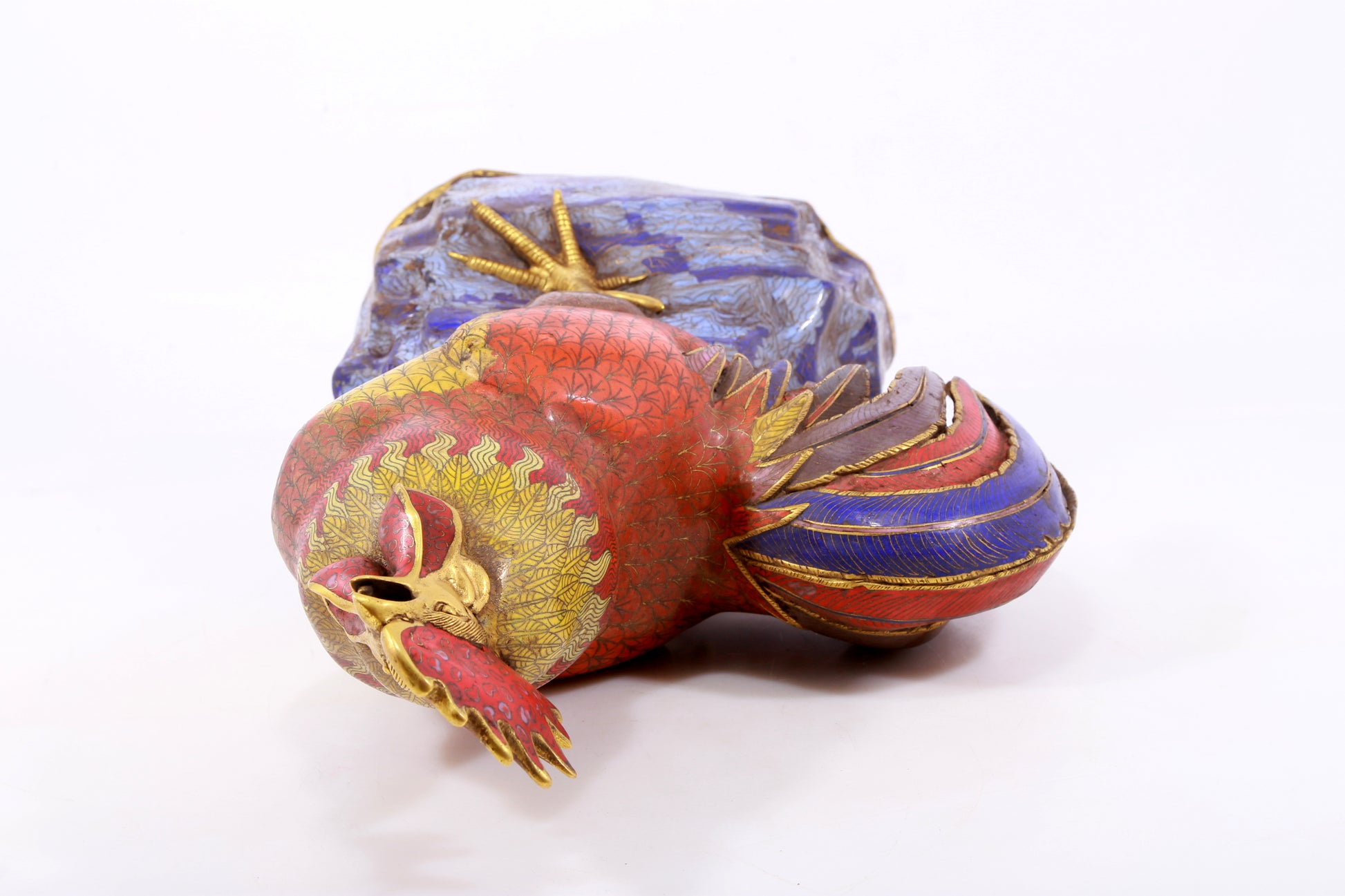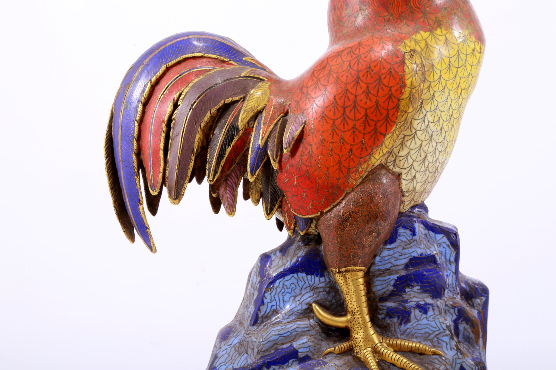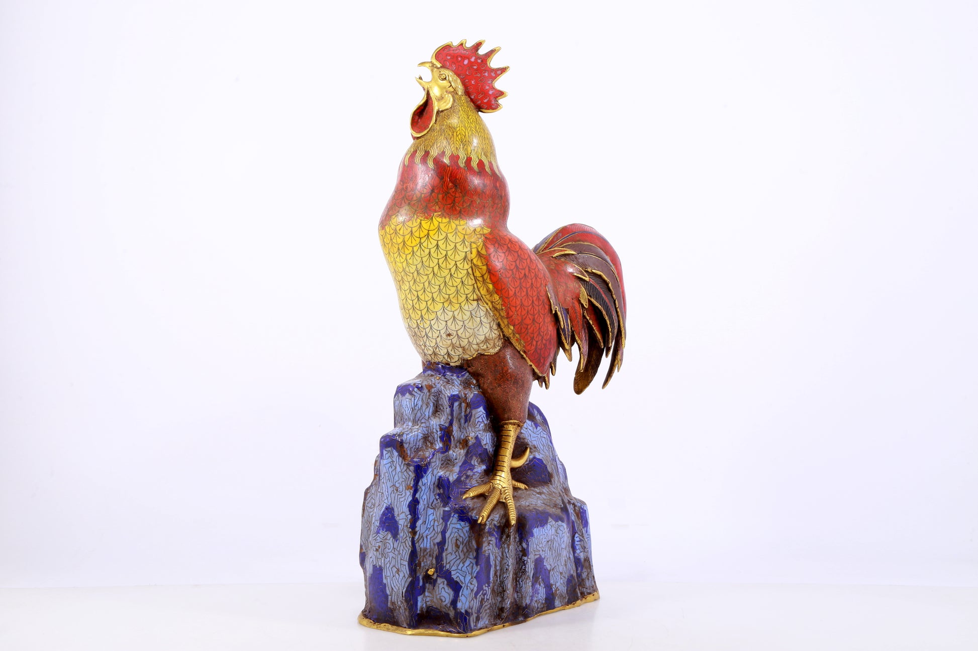 An exquisite cloisonné rooster ornament. The application of filigree technology makes the decoration of this collection more delicate and three-dimensional. This collectible is functional as well as decorative. In ancient China, due to the complex manufacturing process of cloisonne, the difficulty of glaze preparation and firing technology, and the high production cost, this precious enamel product was mainly produced in the palace for the enjoyment of the emperor and the royal family. This is not only a masterpiece of cloisonne craftsmanship, but also a perfect combination of art and craftsmanship. They have profound historical and cultural value, are often treasured and used as decorations, and represent the peak of Qing Dynasty craftsmanship. Qing Dynasty, China, Qianlong four-character mark, Size: 31cmx17cmx59cm, Weight: 12.23KG        景泰蓝公鸡摆件,中国清代,乾隆四字款