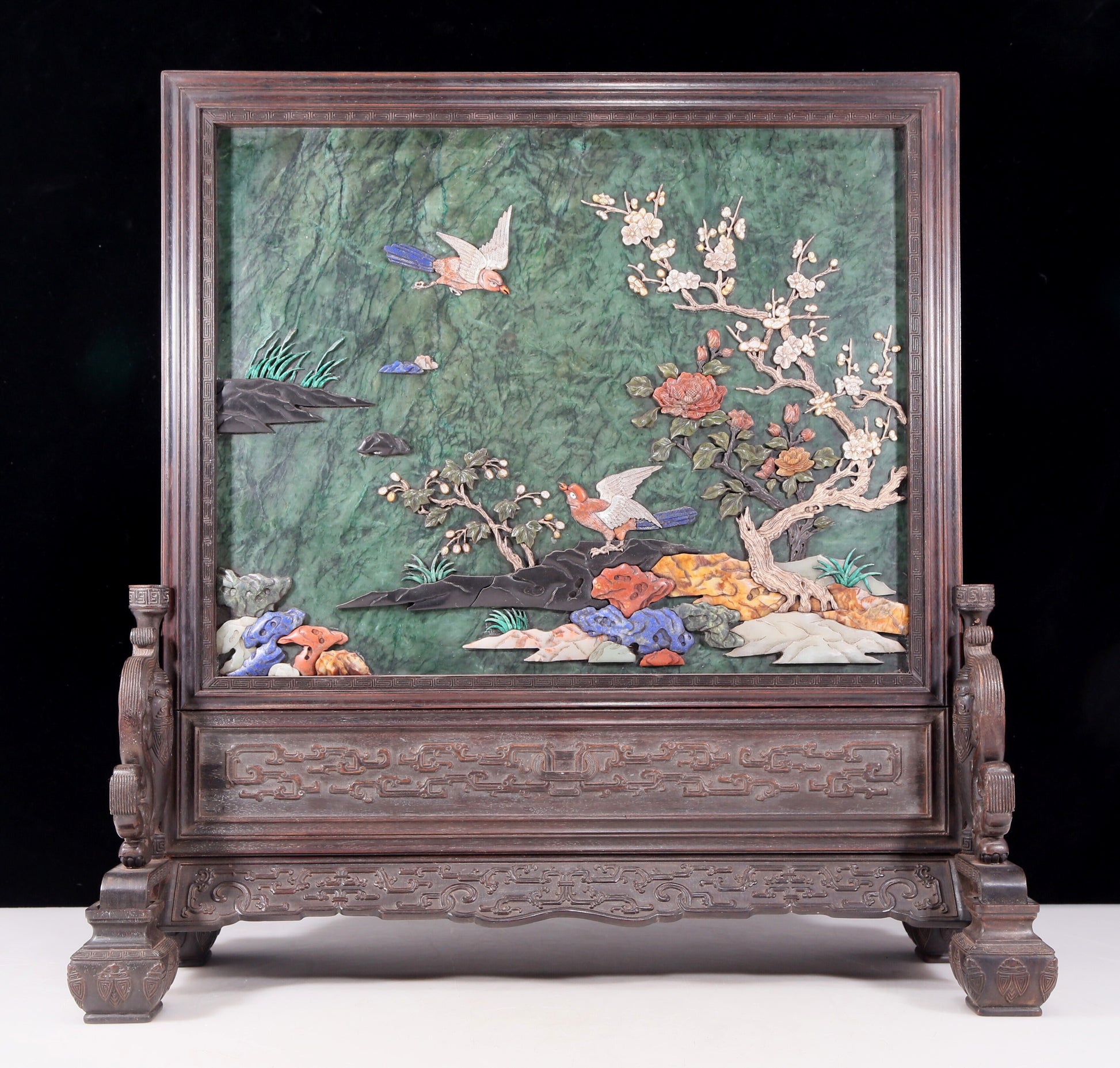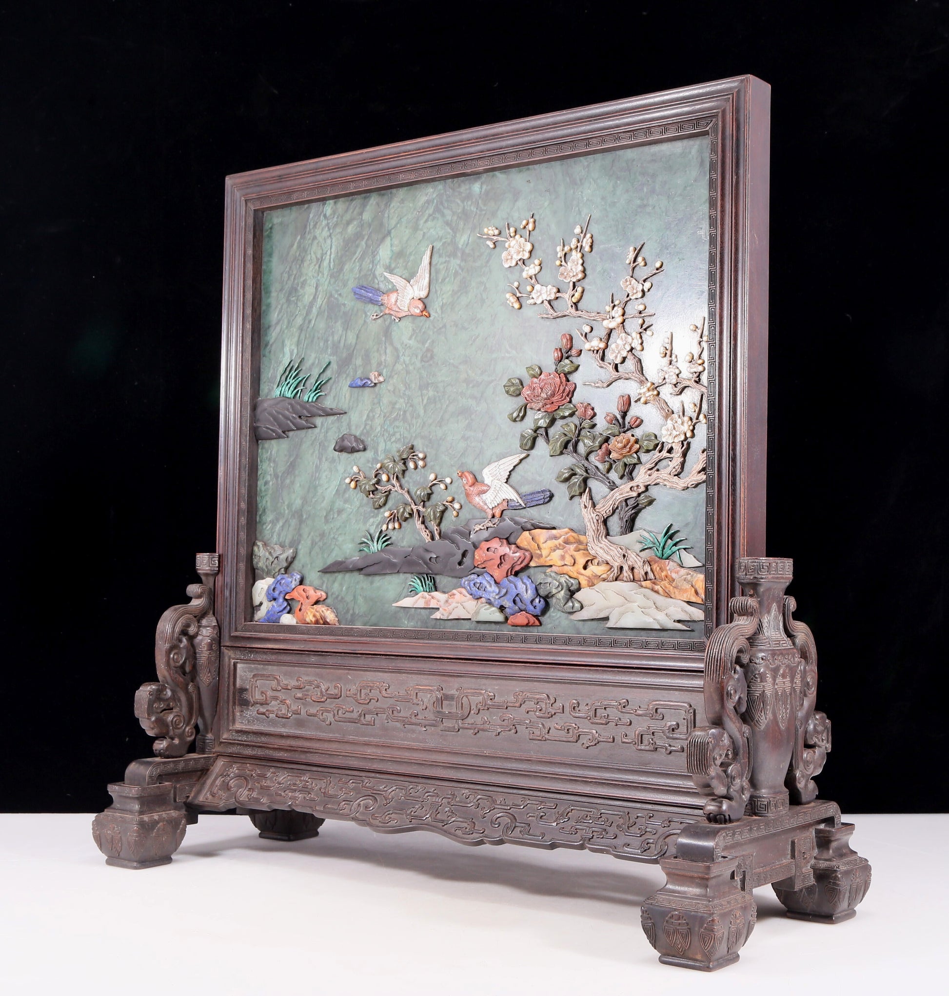An exquisite zitanwood inlaid with jasper, gold and gemstone flower and bird pattern table screen
