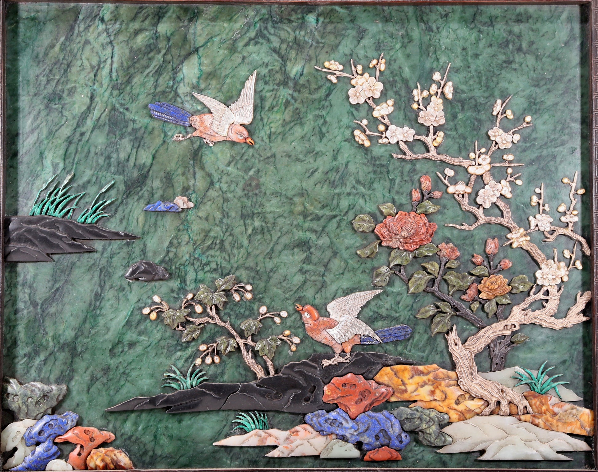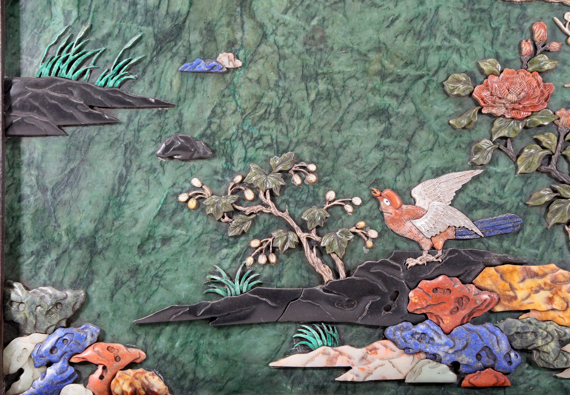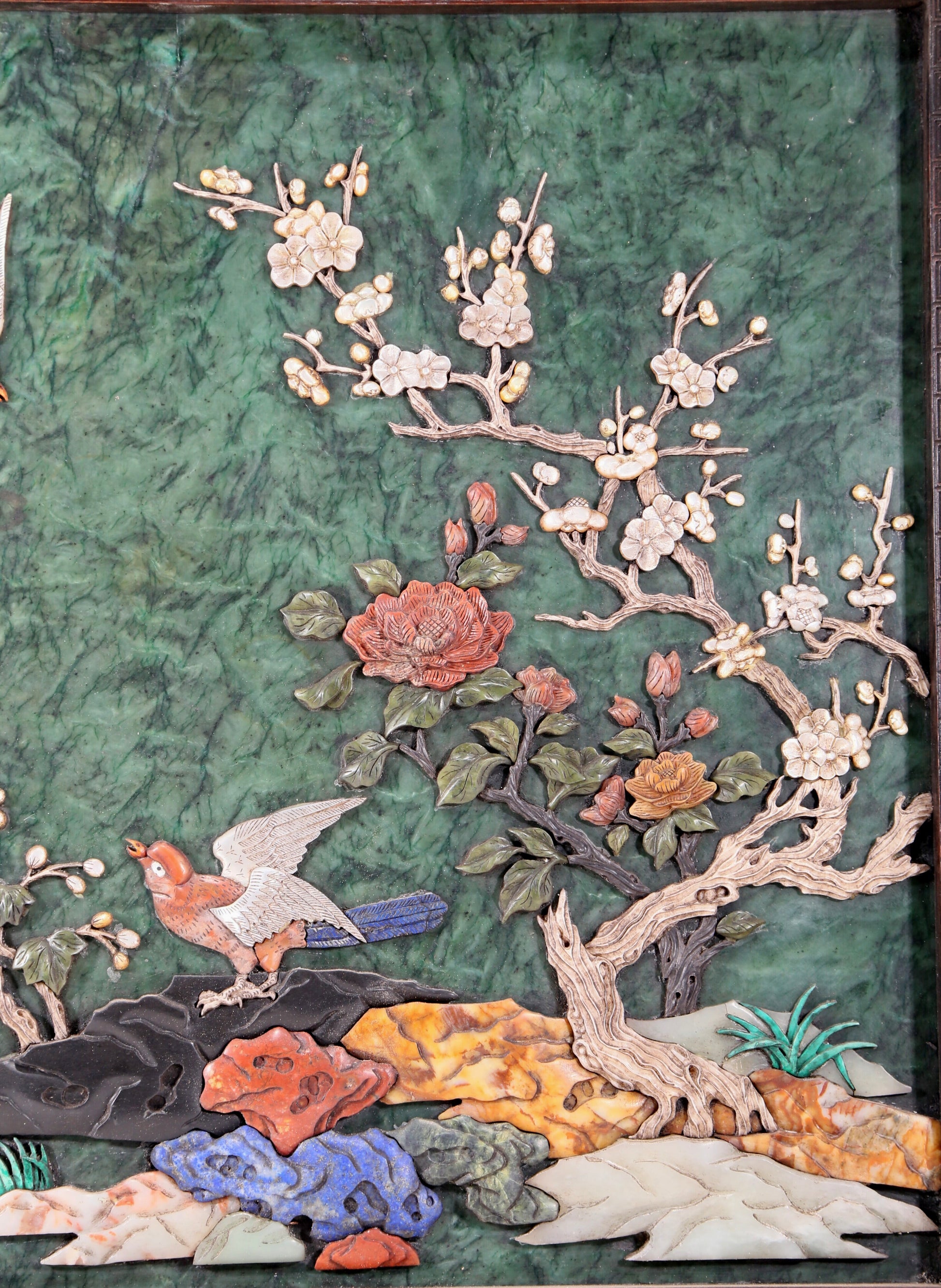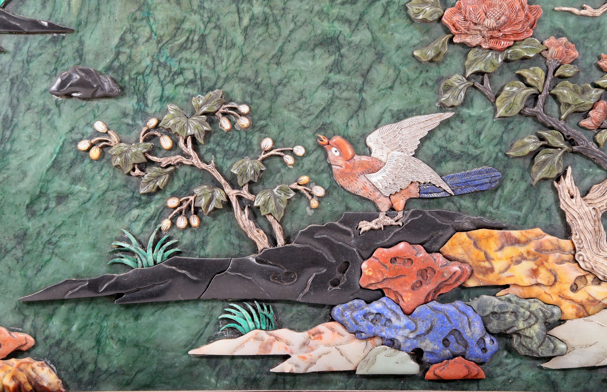 每一处细节都展现着匠人的高超技艺。犹如珠光宝气点缀在花鸟之间,为整体作品增添了华贵和瑰丽的氛围。
