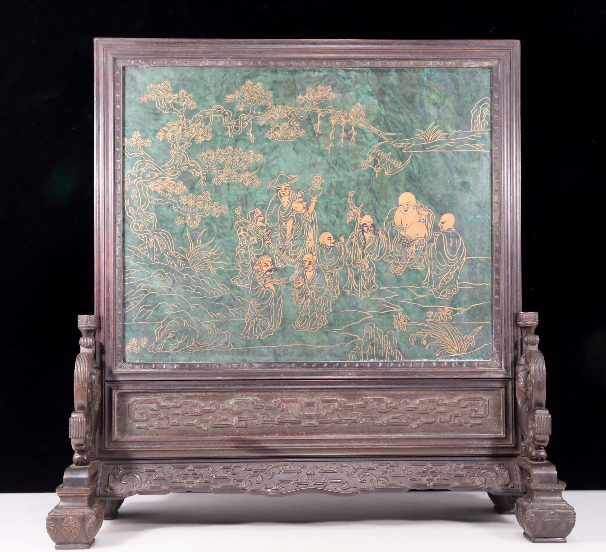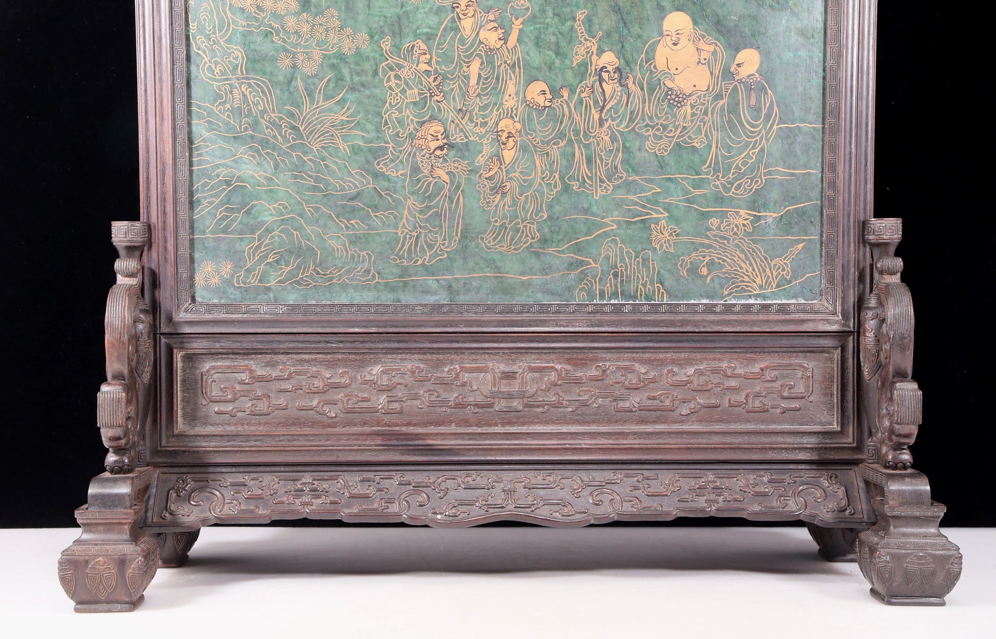 这台屏不仅在技艺上令人叹为观止,更在题材的选择上具有深厚的文化内涵。清代的山水花鸟画传达了深沉的哲理和优雅的审美情趣,这件台屏则是这一传统的完美诠释。它不仅是一件装饰艺术品,更是一扇时光之窗,让人仿佛能够漫步在清代的山水之间。