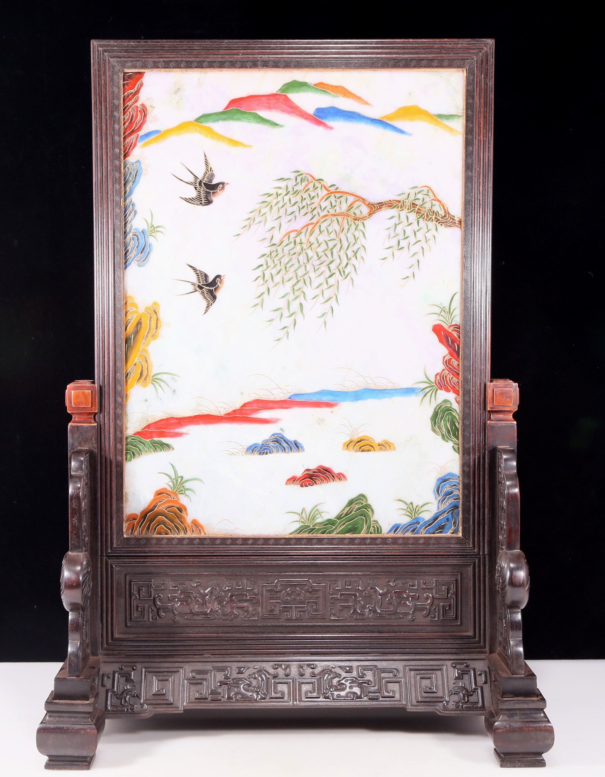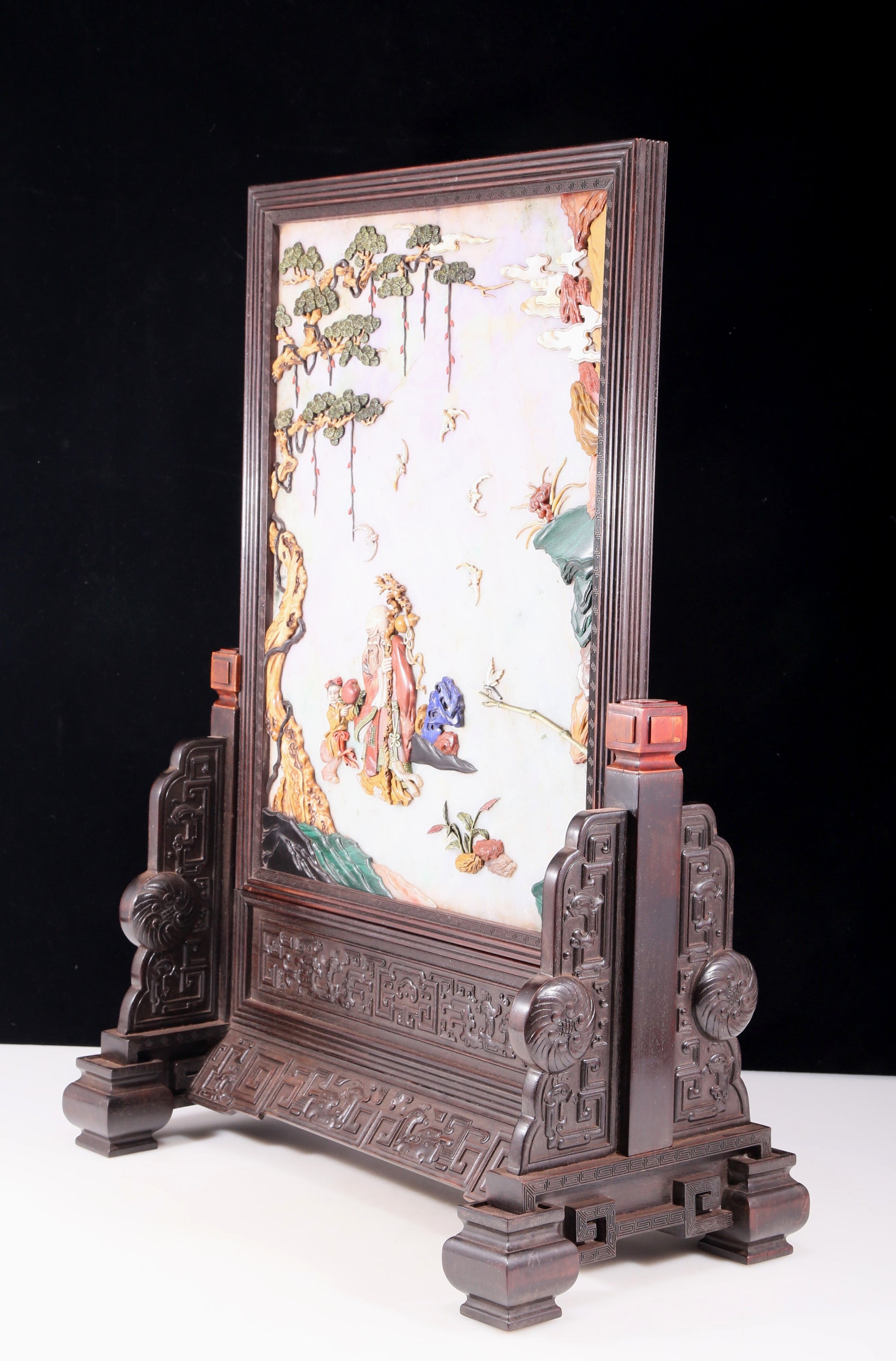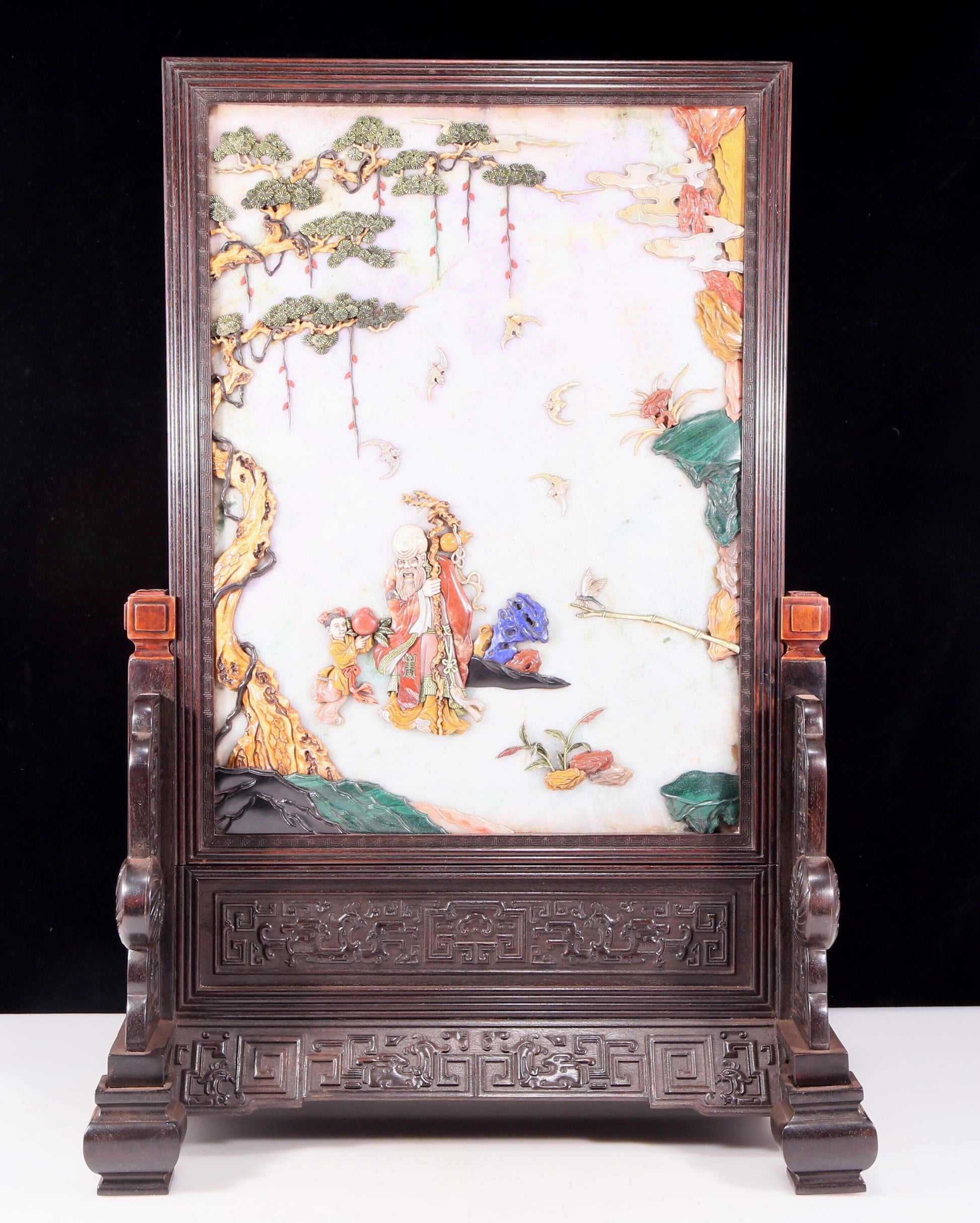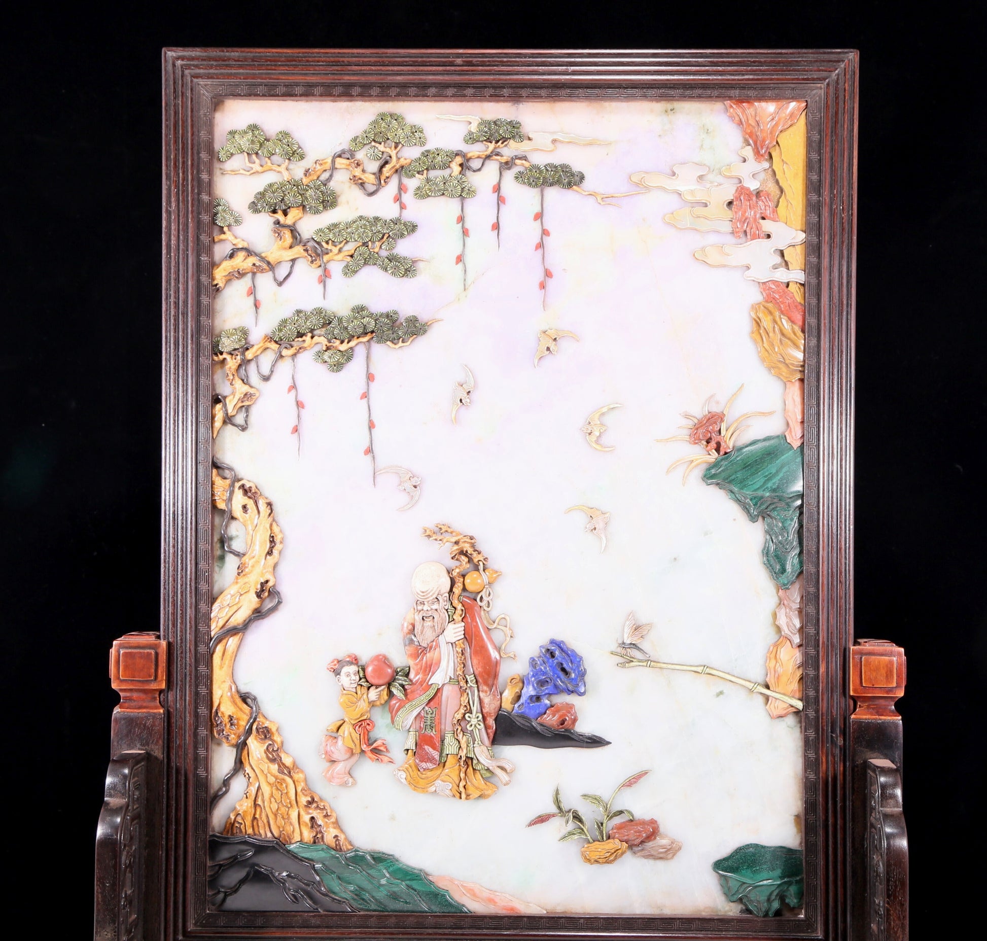 An exquisite zitanwood table screen filled with lacquer, painted with gold and inlaid with gems and figures.  Qing Dynasty , China.. It used zitanwood as the base material and was filled with lacquer using exquisite craftsmanship. In the paint-filling process, gemstones are cleverly embedded, just like stars dotting the night sky, exuding a unique brilliance. The overall pattern carving is lifelike, demonstrating the craftsman's superb carving skills. Size:50cmx27cmx72cm. Weight:13255g       紫檀木填漆描金嵌百宝贺寿图台屏, 中国清代,采用了紫檀木作为基材,经过精湛的工艺填漆而成。填漆工艺中,巧妙地嵌入了宝石,犹如星辰点缀夜空,散发出独特的光彩。整体图案雕刻栩栩如生,展示了匠师高超的雕刻技艺。