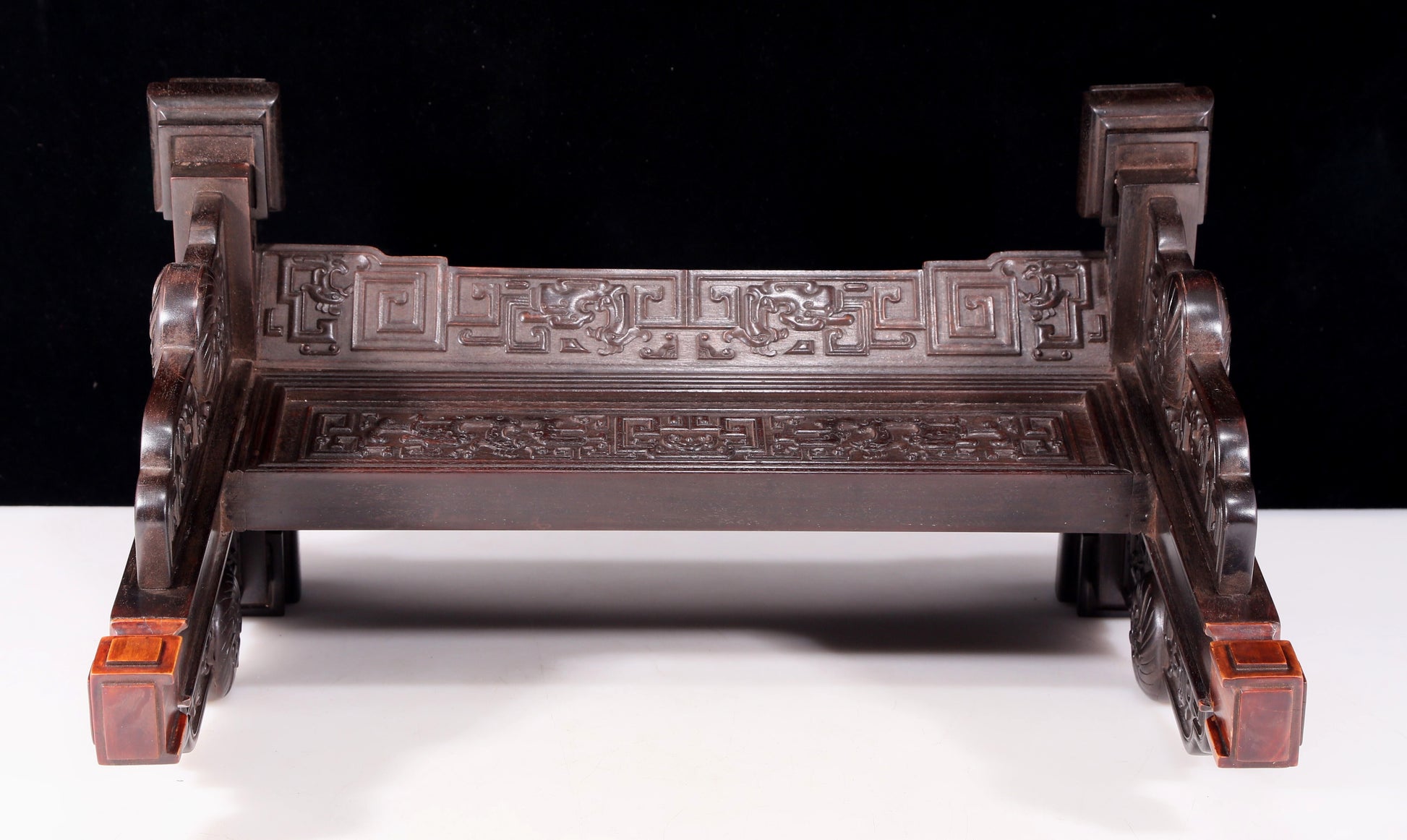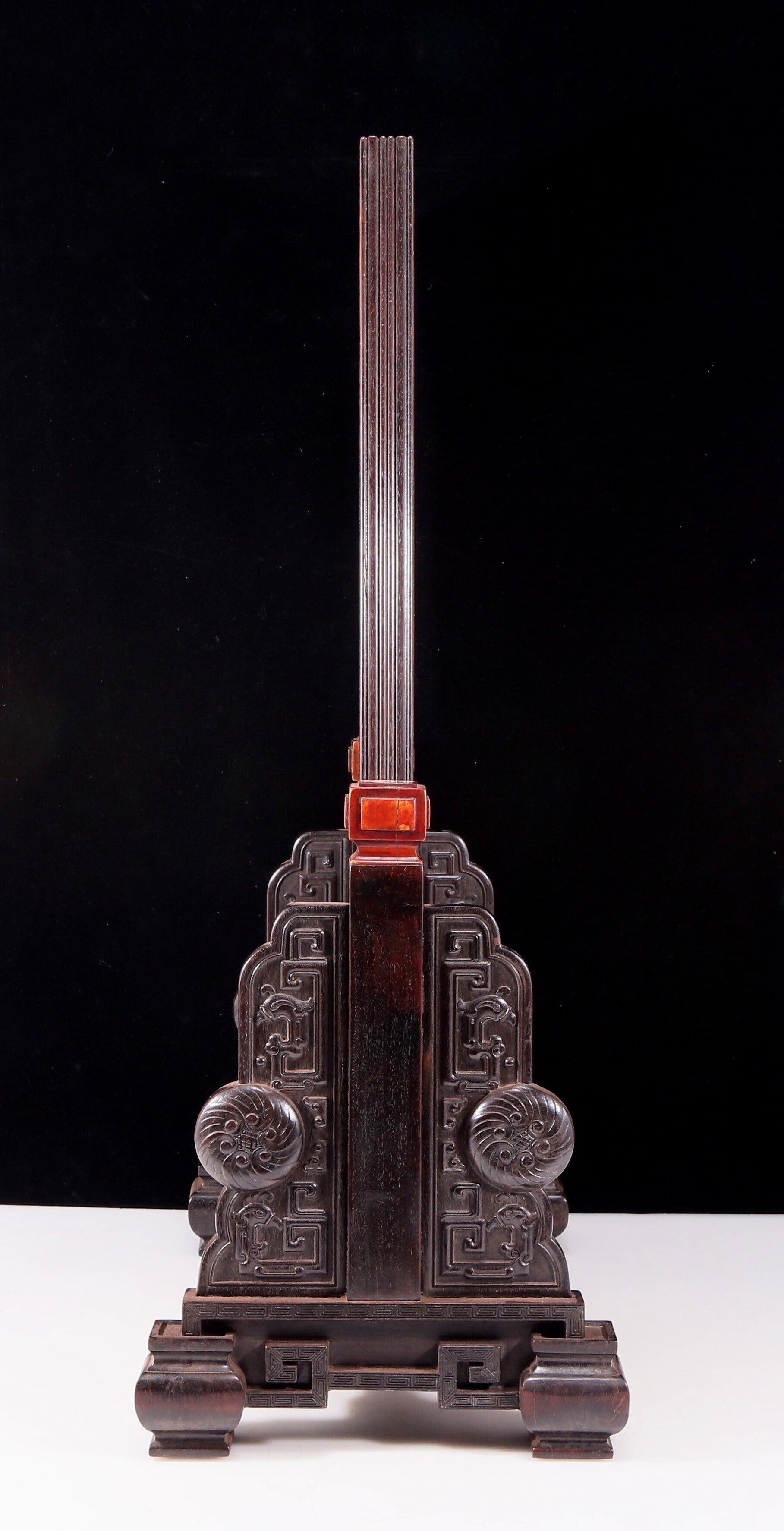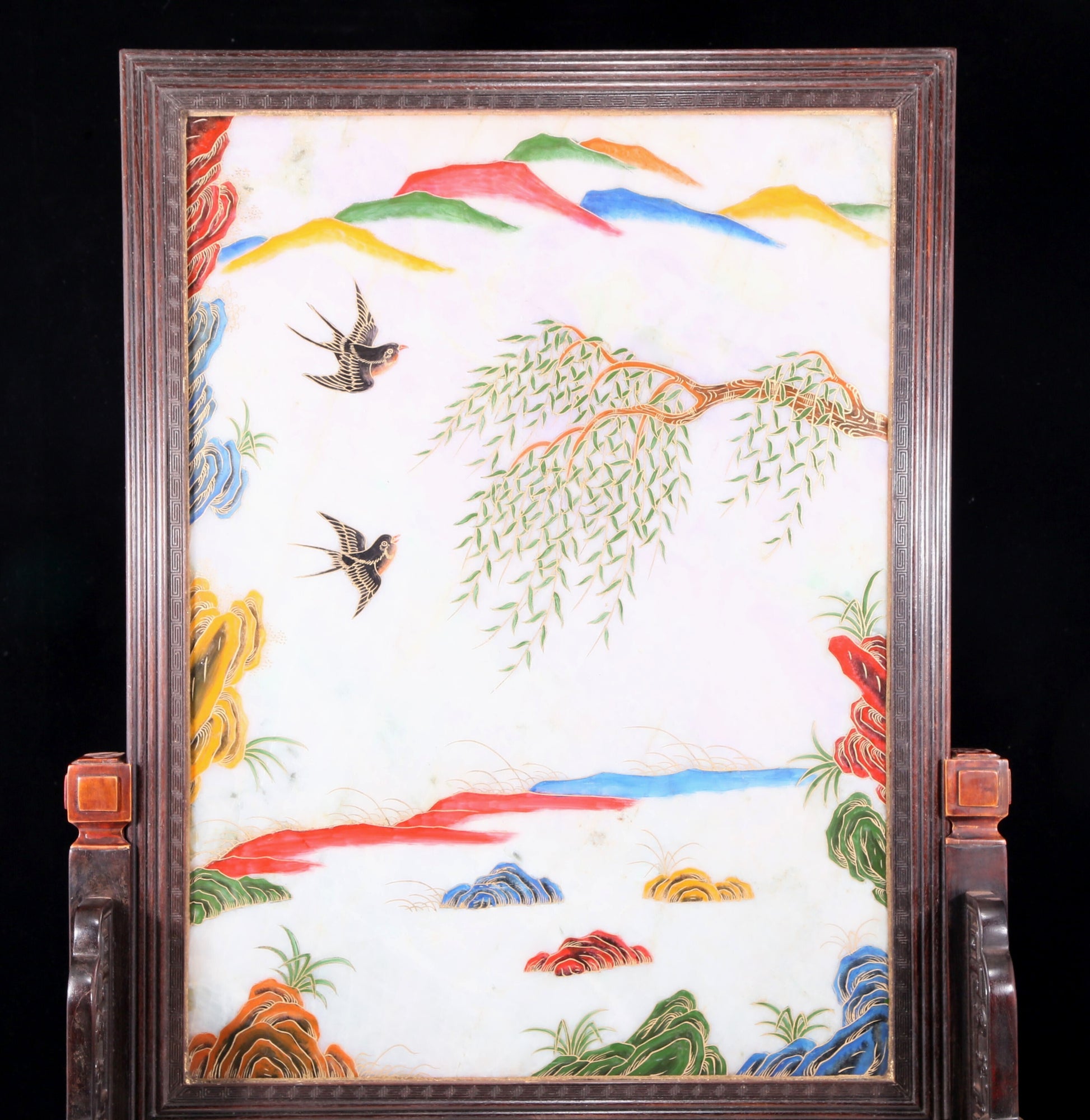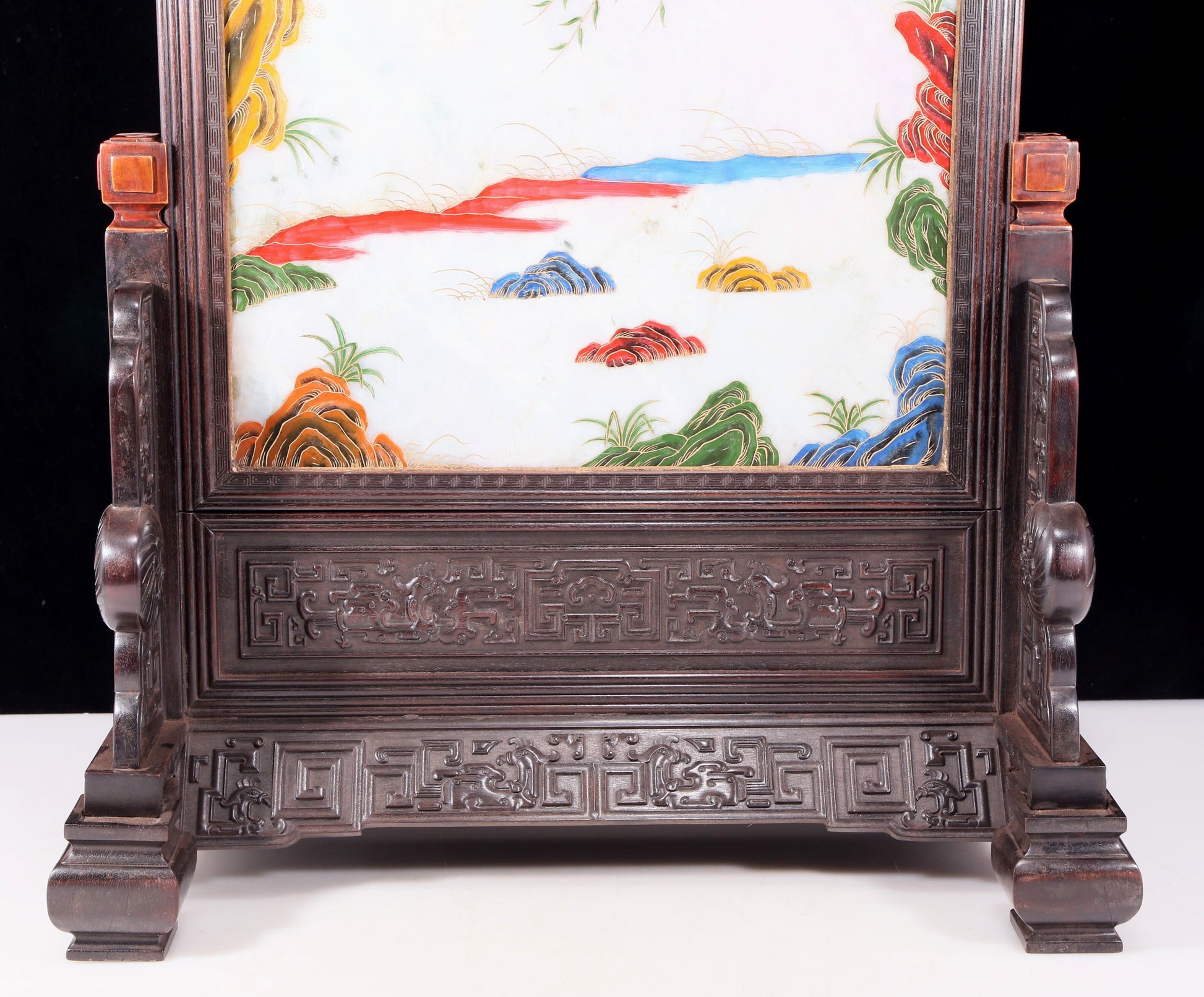 An exquisite zitanwood table screen filled with lacquer, painted with gold and inlaid with gems and figures.  Qing Dynasty , China.. It used zitanwood as the base material and was filled with lacquer using exquisite craftsmanship. In the paint-filling process, gemstones are cleverly embedded, just like stars dotting the night sky, exuding a unique brilliance. The overall pattern carving is lifelike, demonstrating the craftsman's superb carving skills. Size:50cmx27cmx72cm. Weight:13255g       紫檀木填漆描金嵌百宝贺寿图台屏, 中国清代,采用了紫檀木作为基材,经过精湛的工艺填漆而成。填漆工艺中,巧妙地嵌入了宝石,犹如星辰点缀夜空,散发出独特的光彩。整体图案雕刻栩栩如生,展示了匠师高超的雕刻技艺。