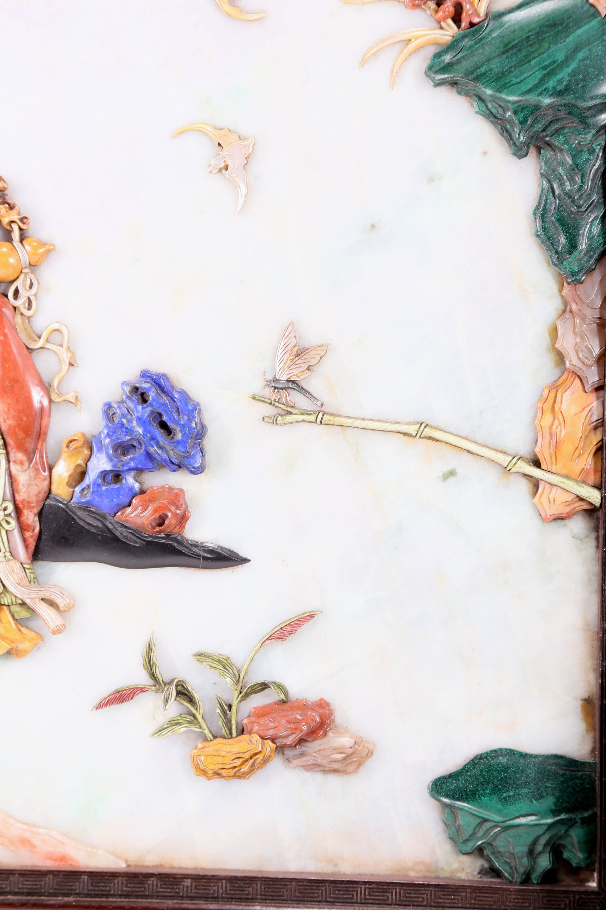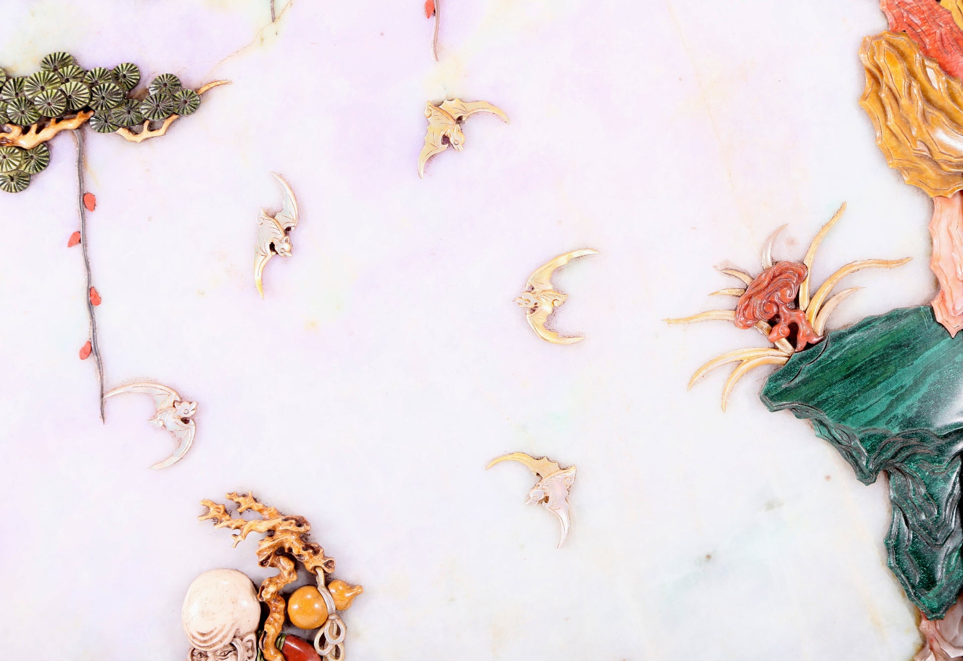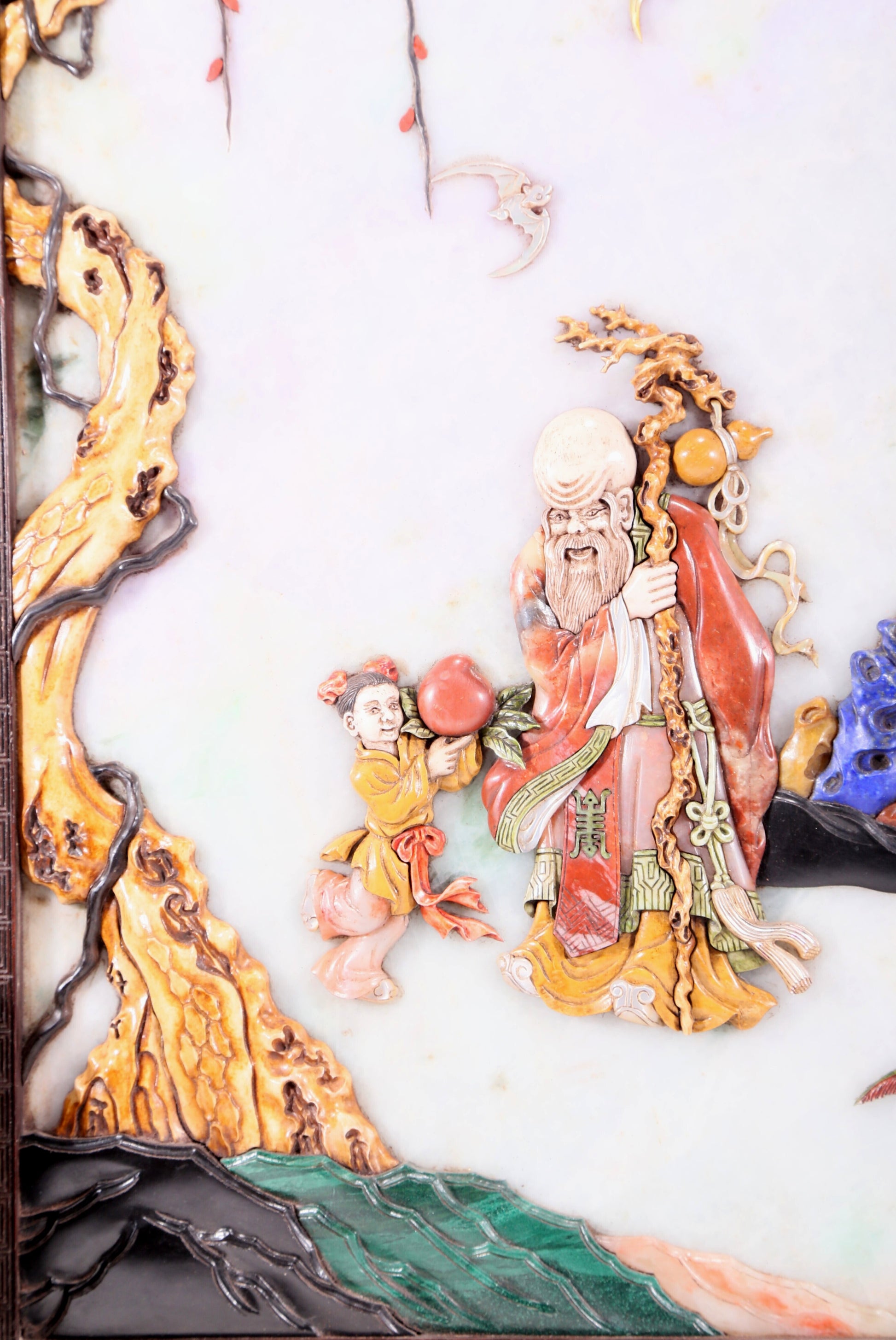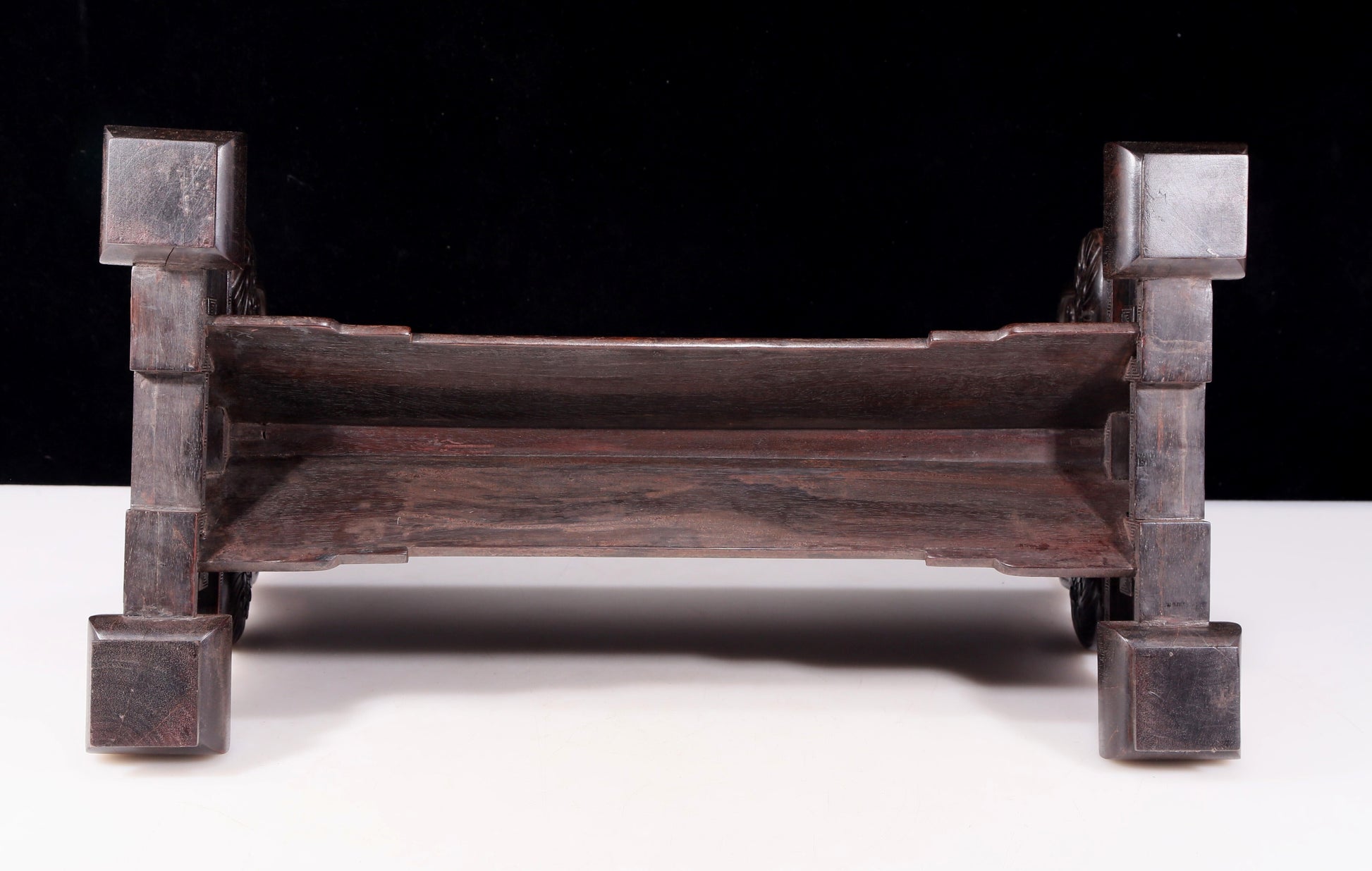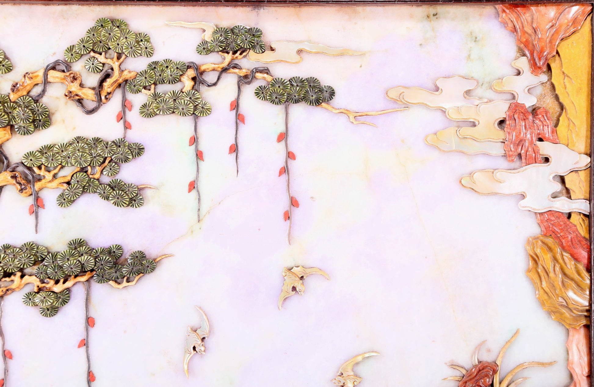 An exquisite zitanwood table screen filled with lacquer, painted with gold and inlaid with gems and figures.  Qing Dynasty , China.. It used zitanwood as the base material and was filled with lacquer using exquisite craftsmanship. In the paint-filling process, gemstones are cleverly embedded, just like stars dotting the night sky, exuding a unique brilliance. The overall pattern carving is lifelike, demonstrating the craftsman's superb carving skills. Size:50cmx27cmx72cm. Weight:13255g       紫檀木填漆描金嵌百宝贺寿图台屏, 中国清代,采用了紫檀木作为基材,经过精湛的工艺填漆而成。填漆工艺中,巧妙地嵌入了宝石,犹如星辰点缀夜空,散发出独特的光彩。整体图案雕刻栩栩如生,展示了匠师高超的雕刻技艺。