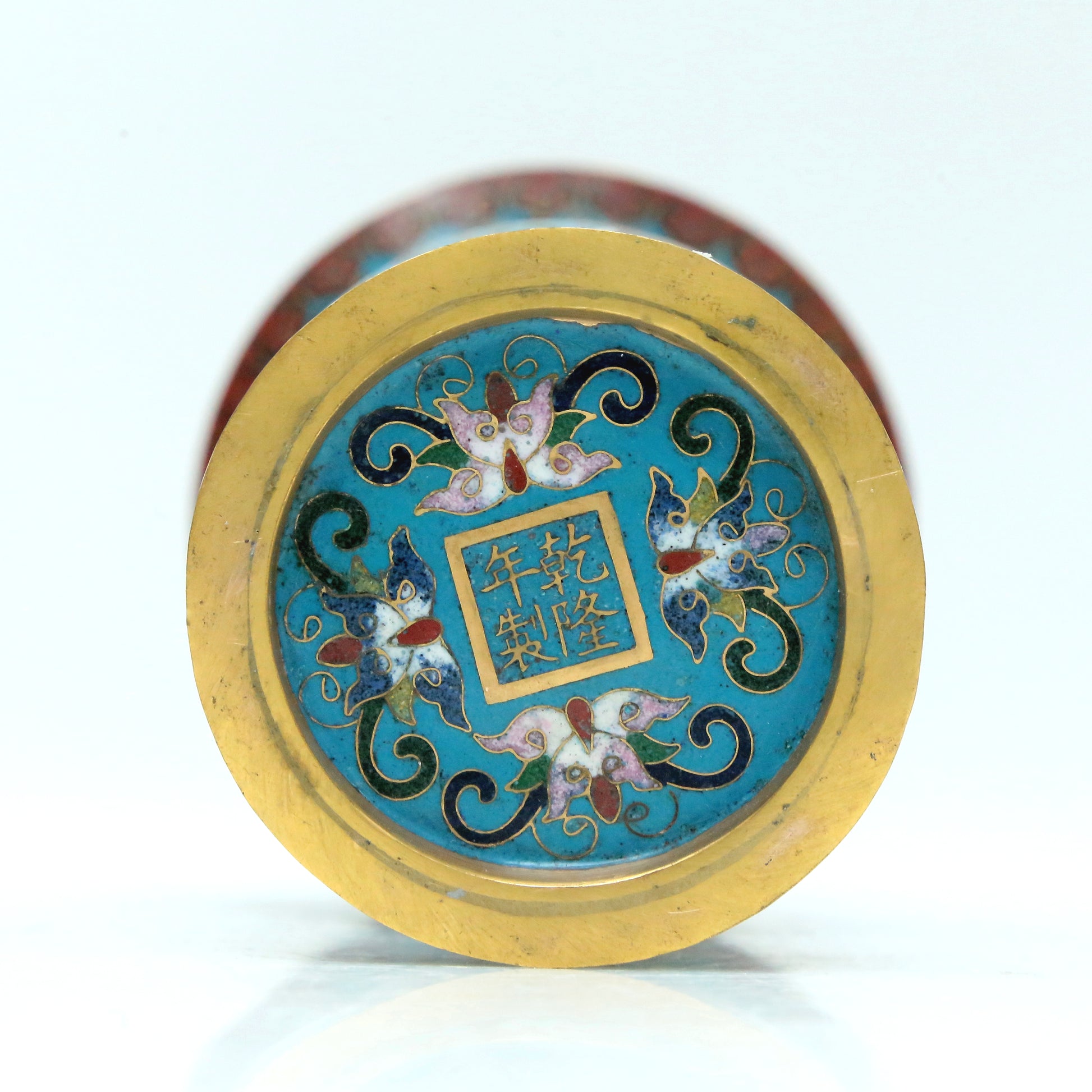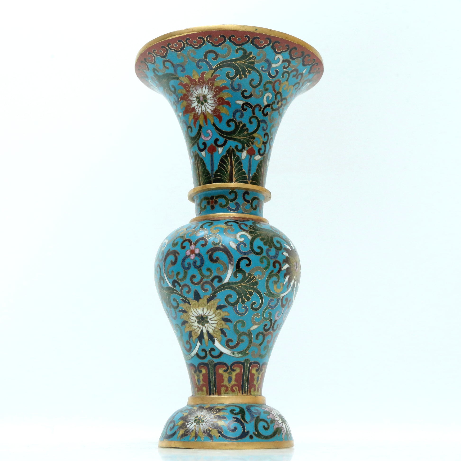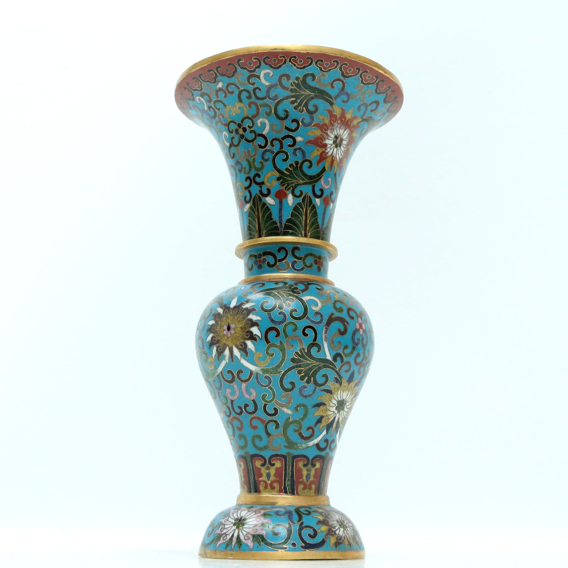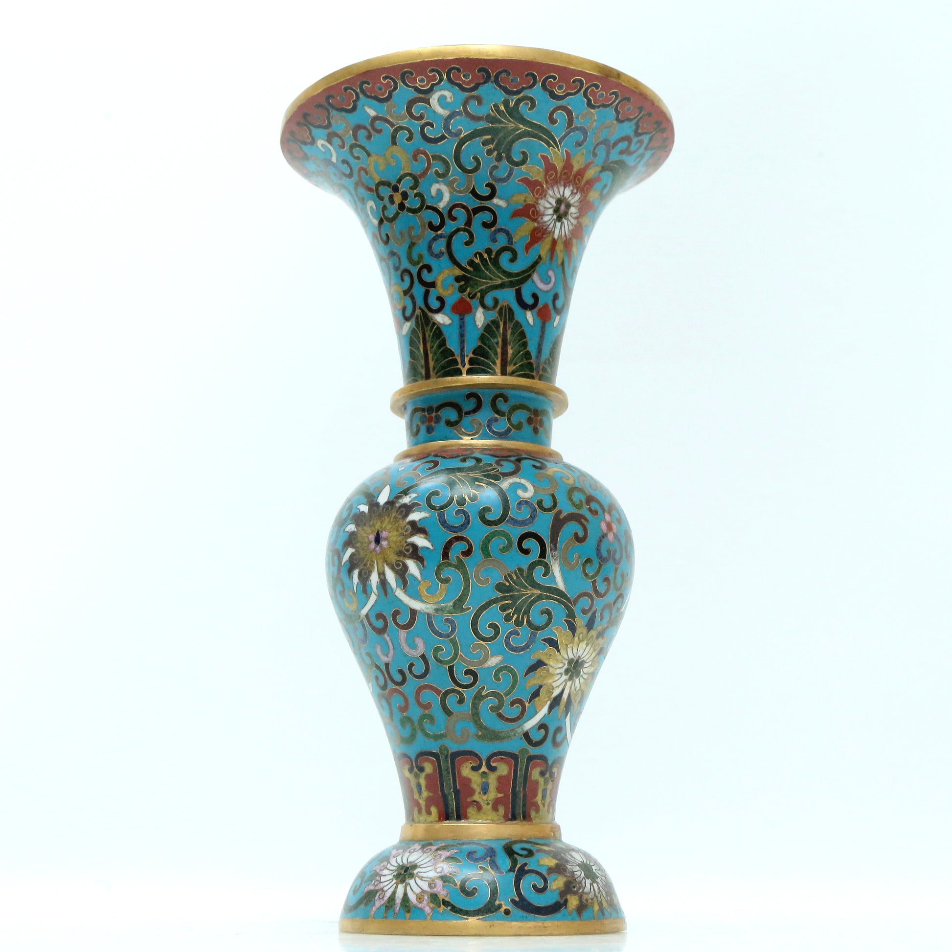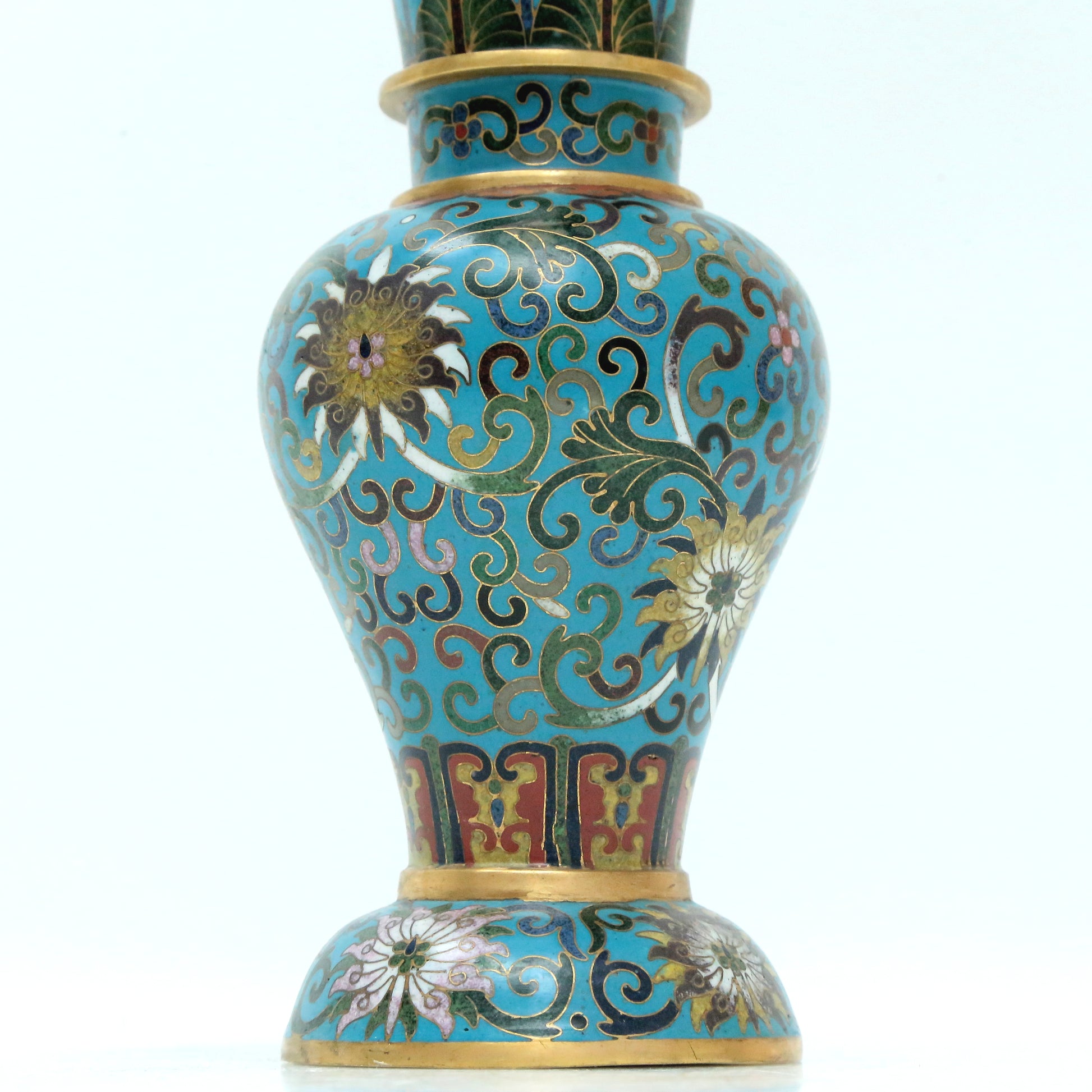 A Fine Pair Of Cloisonne 'Scrolling Lotus' Vases. Each is enameled with polychrome patterns, all reserved on a bright turquoise ground, also cast with a flaring top. Chinese Qing Dynasty. Qianlong Four-Character Mark. Size:12.5cmx24.5cm. Weight:2475g      清代 乾隆年制 景泰蓝缠枝莲纹瓶