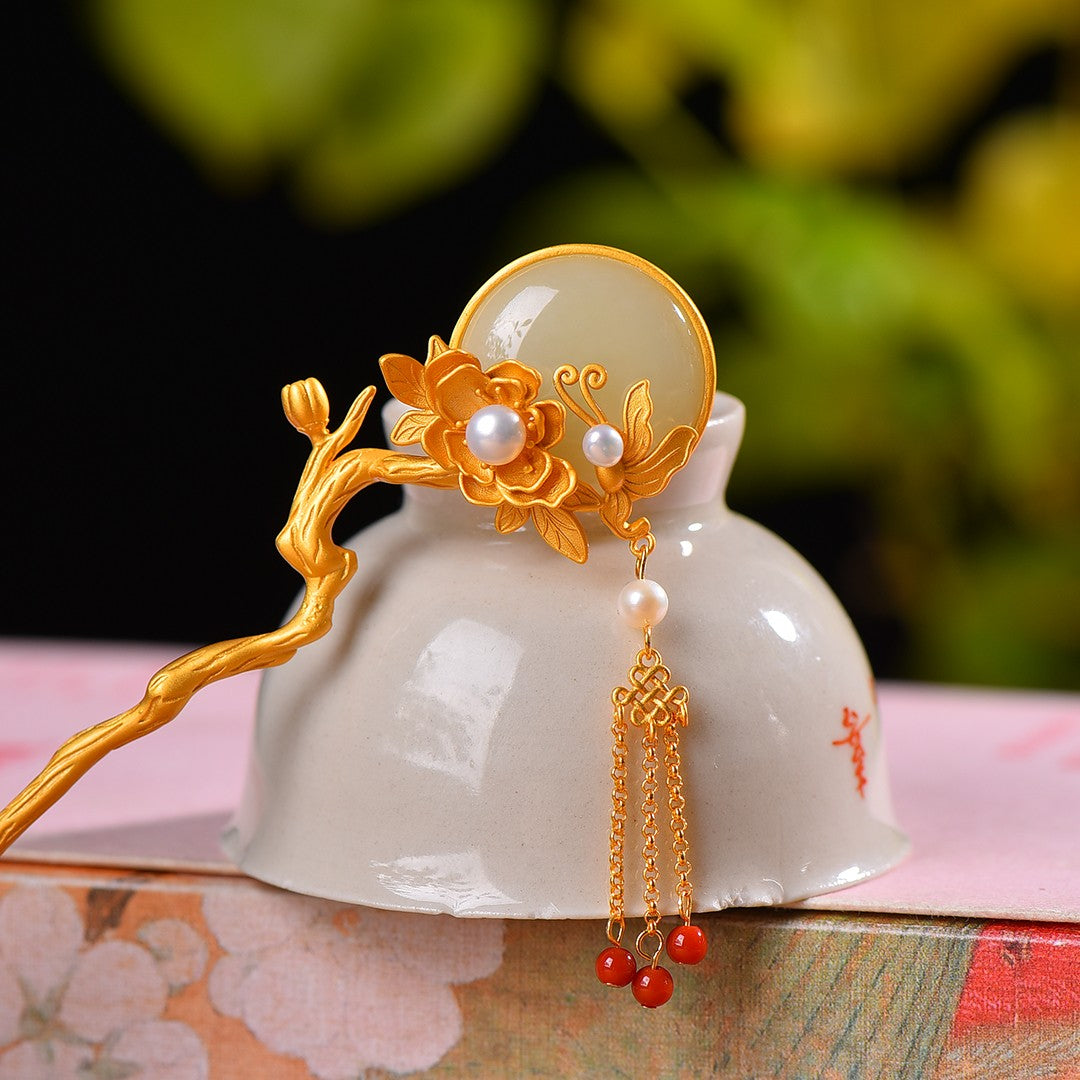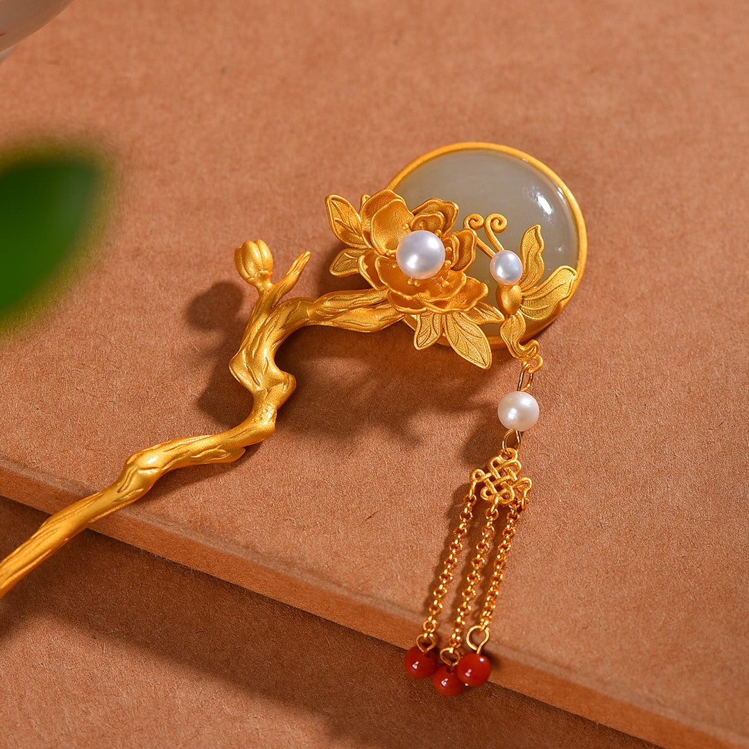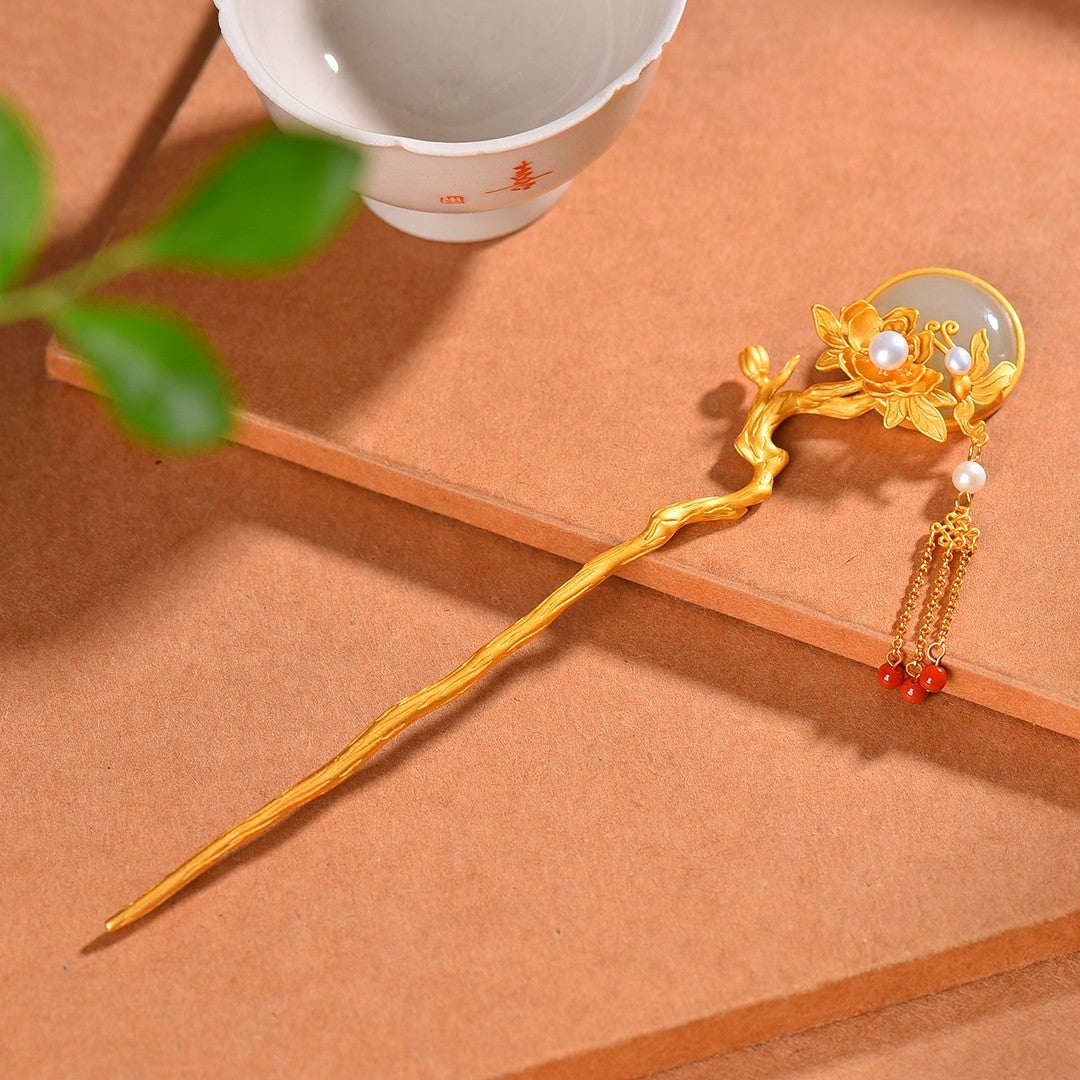 Gilt silver inlaid Hetian jade butterfly and lotus tassel hairpin