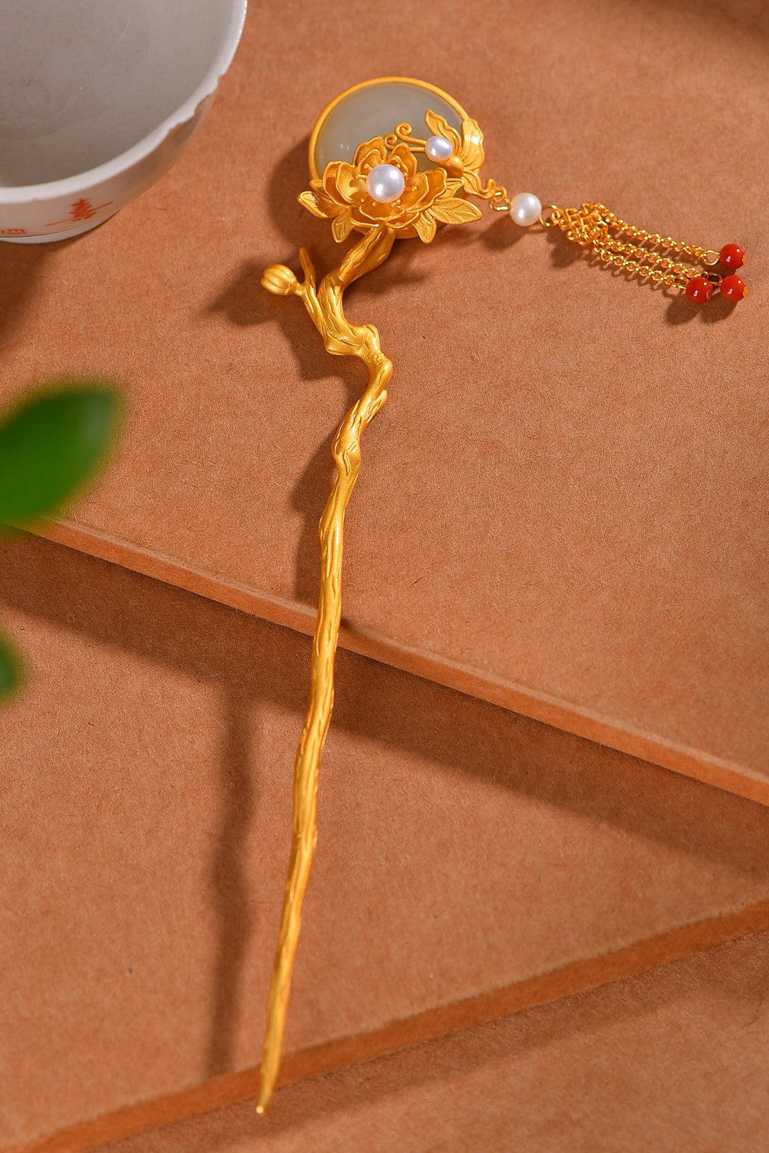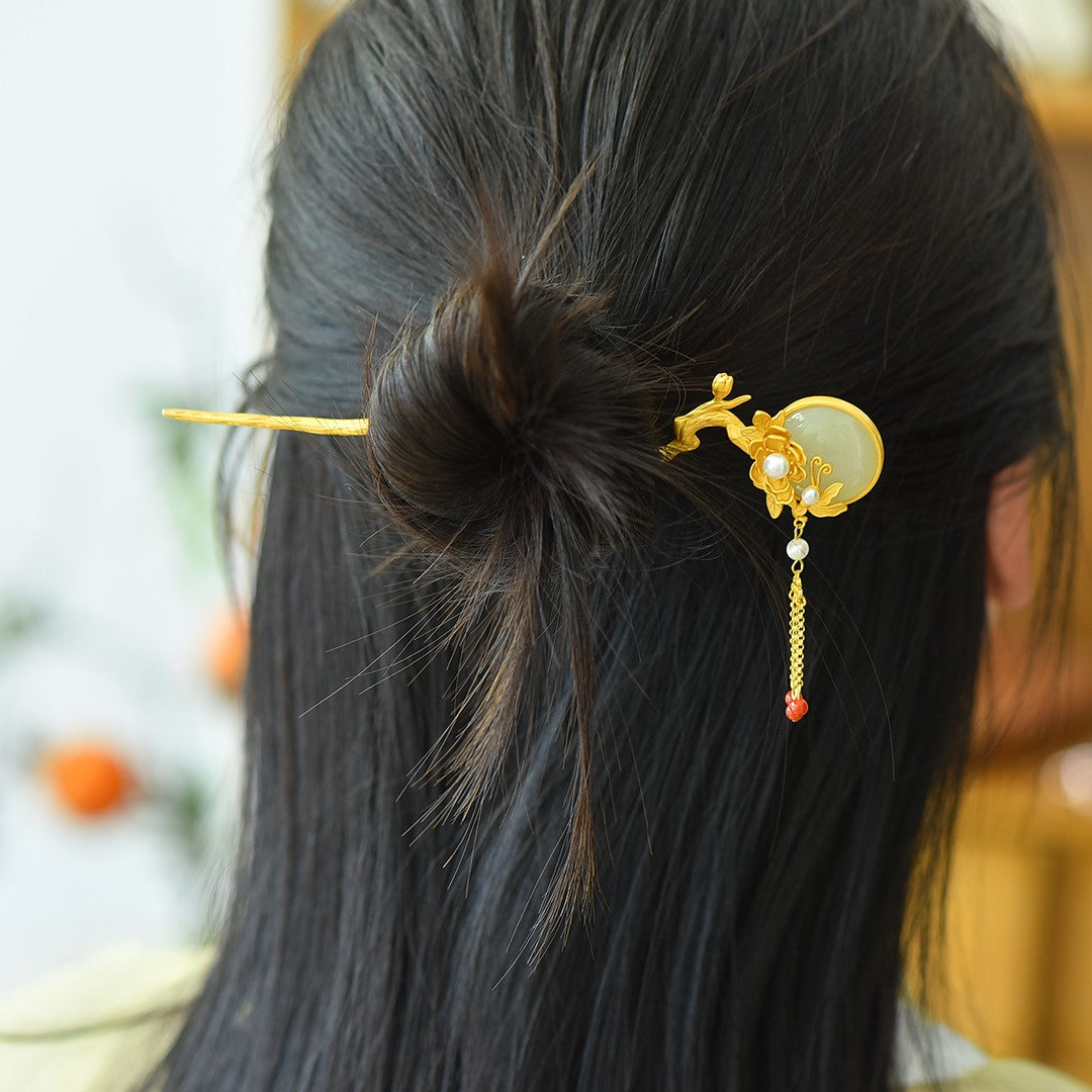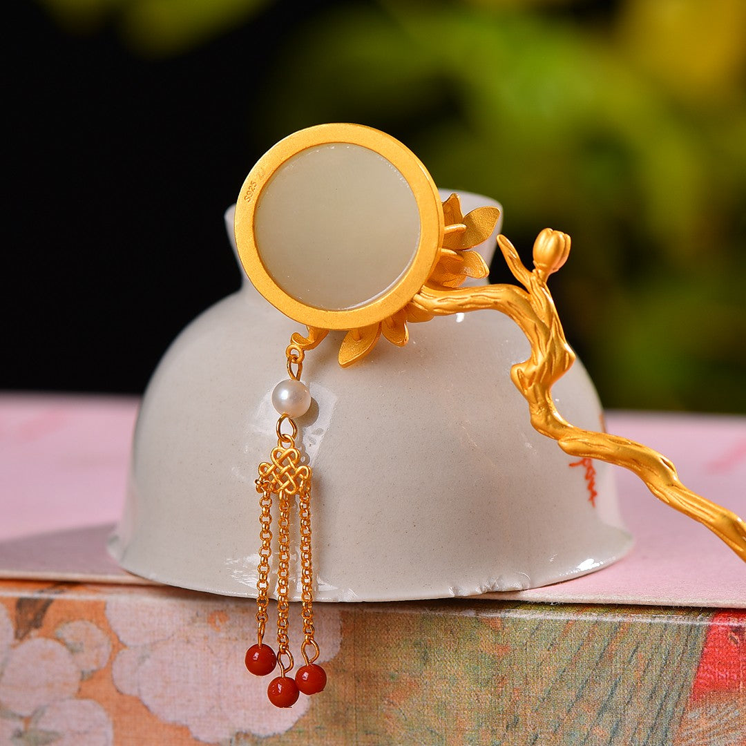 Gilt silver inlaid Hetian jade butterfly and lotus tassel hairpin