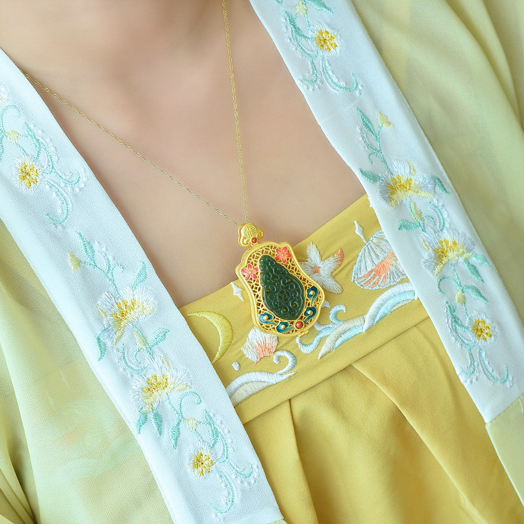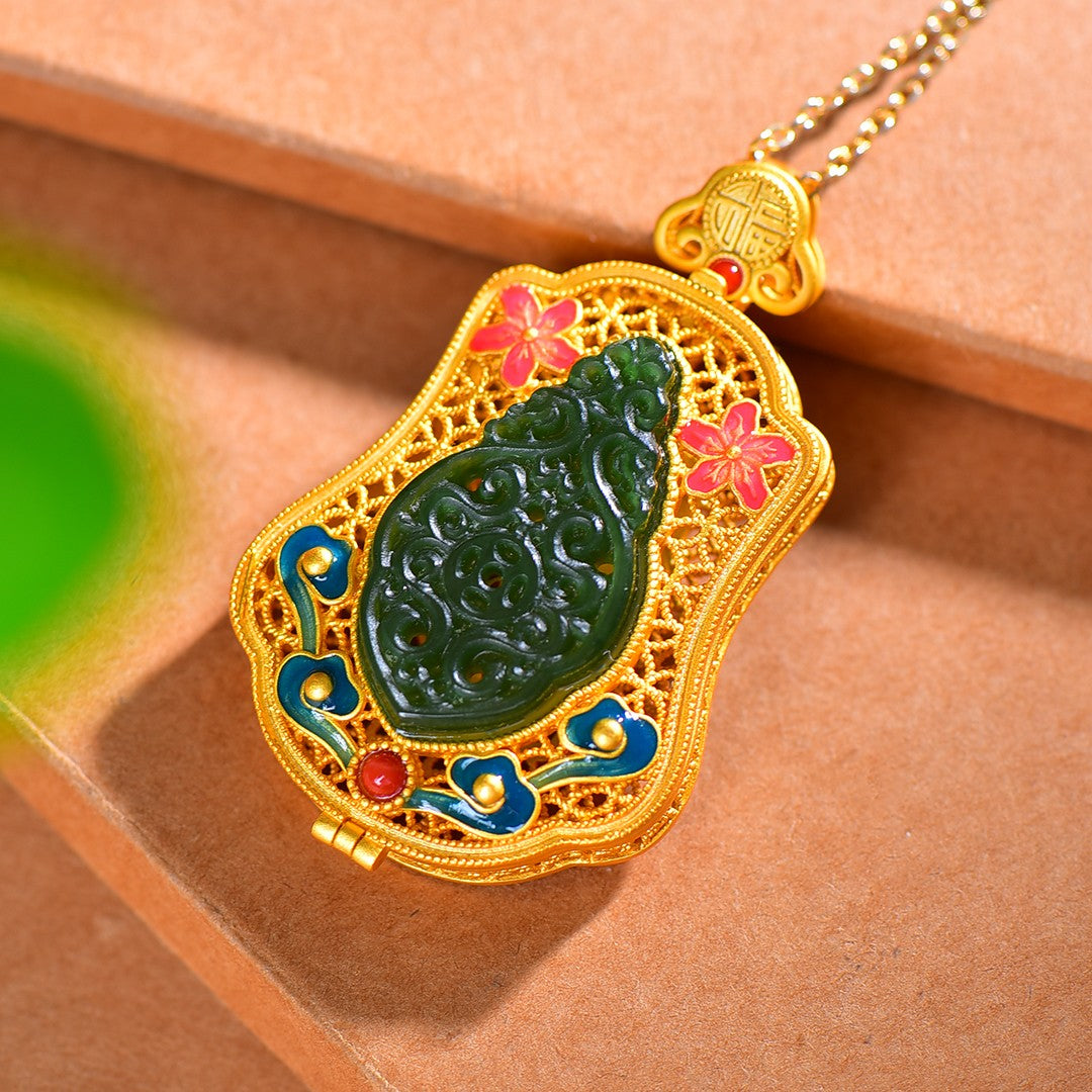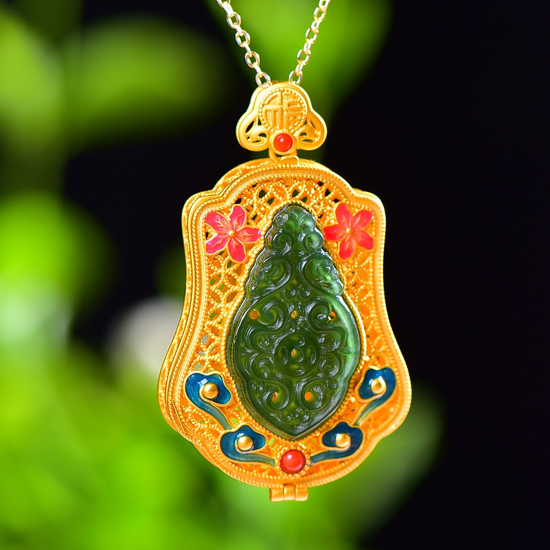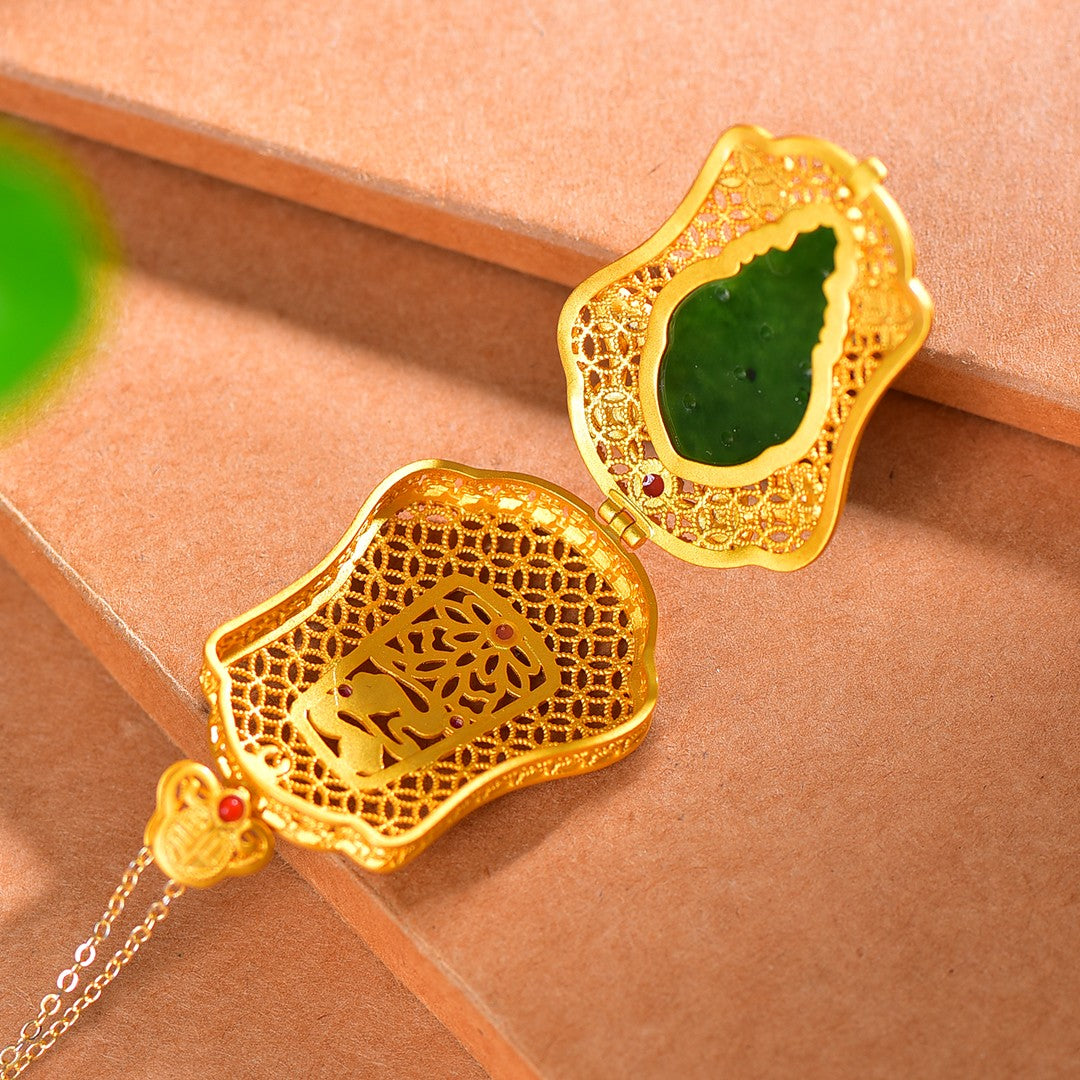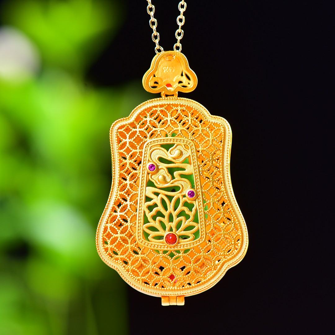 Gilt silver inlaid Hetian jasper hollow sachet pendant
