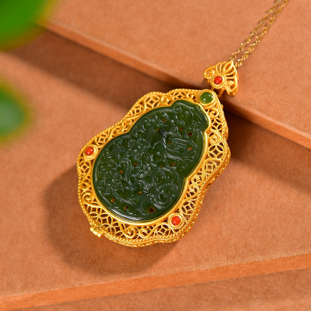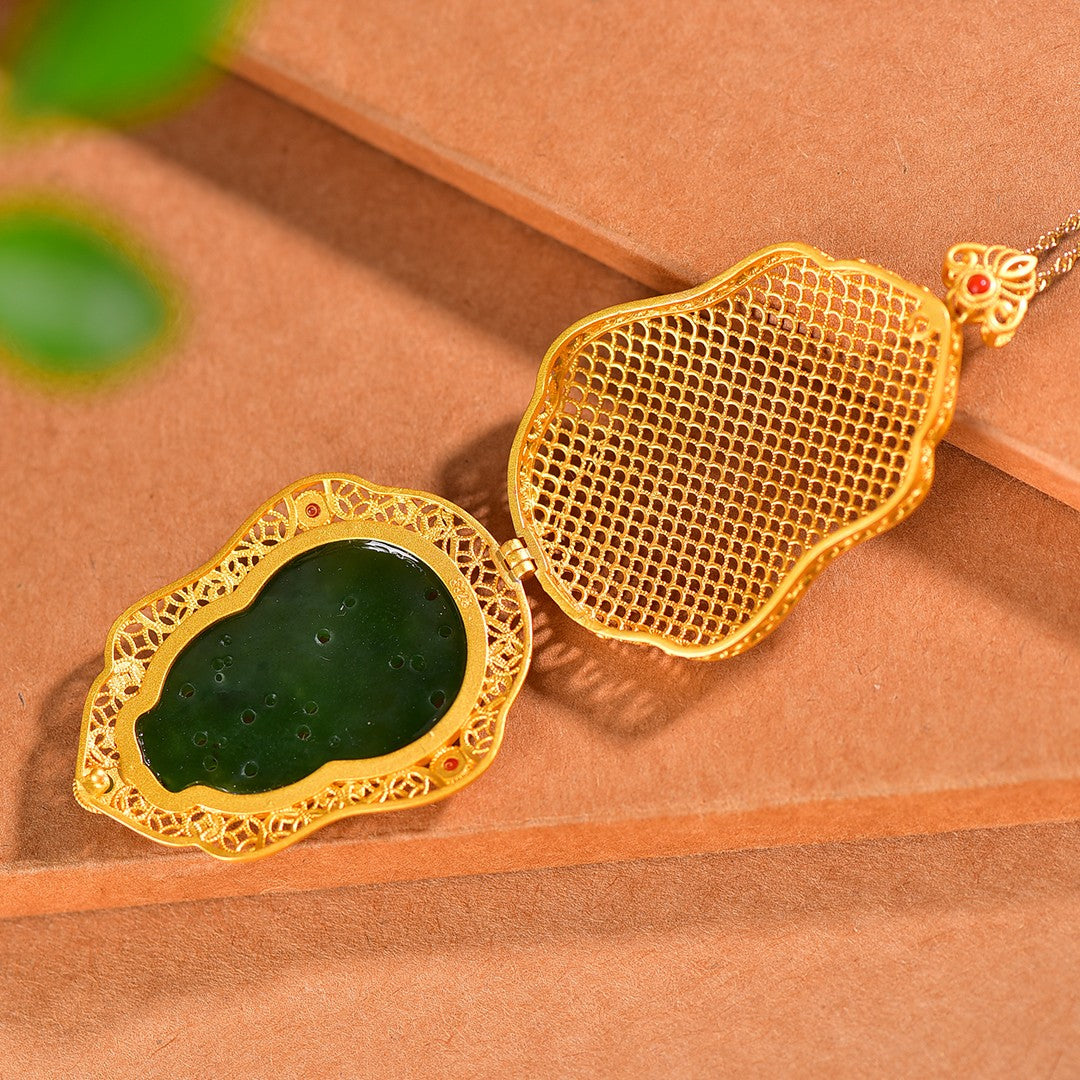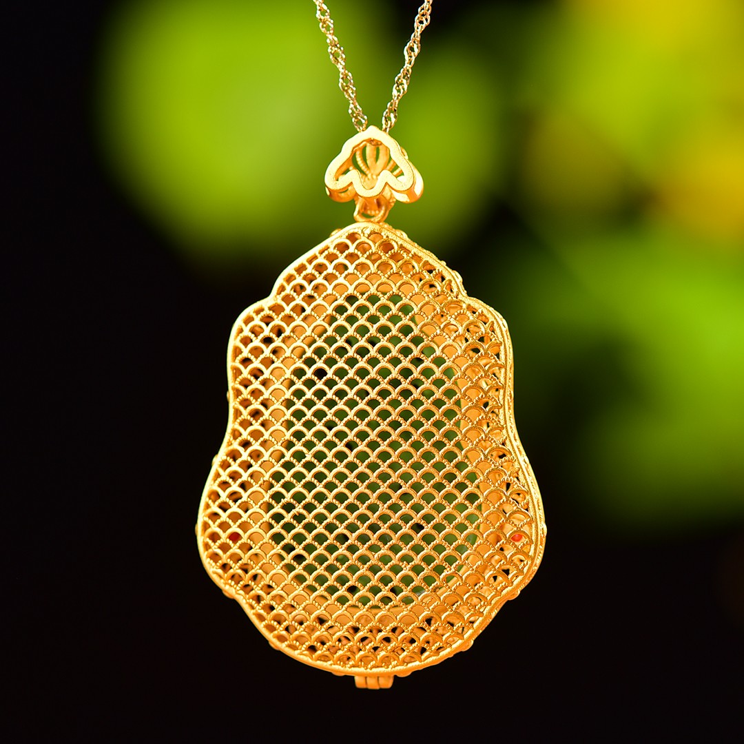 Silver gilt inlaid with jasper hollow and multi-treasure sachet pendant, jade size: 35mmx24mm        银鎏金镶嵌碧玉镂空配多宝香囊吊坠,玉石尺寸:35mmx24mm