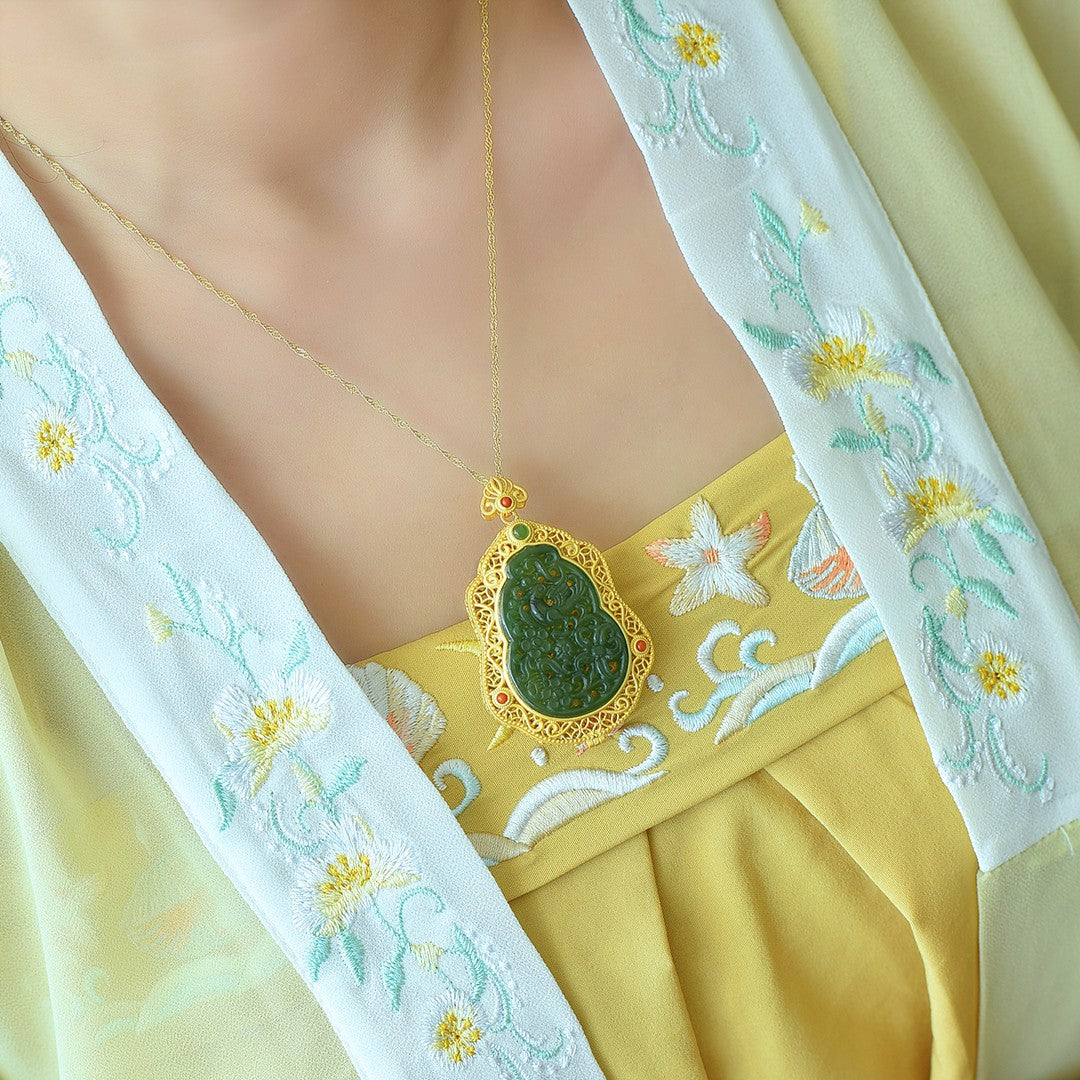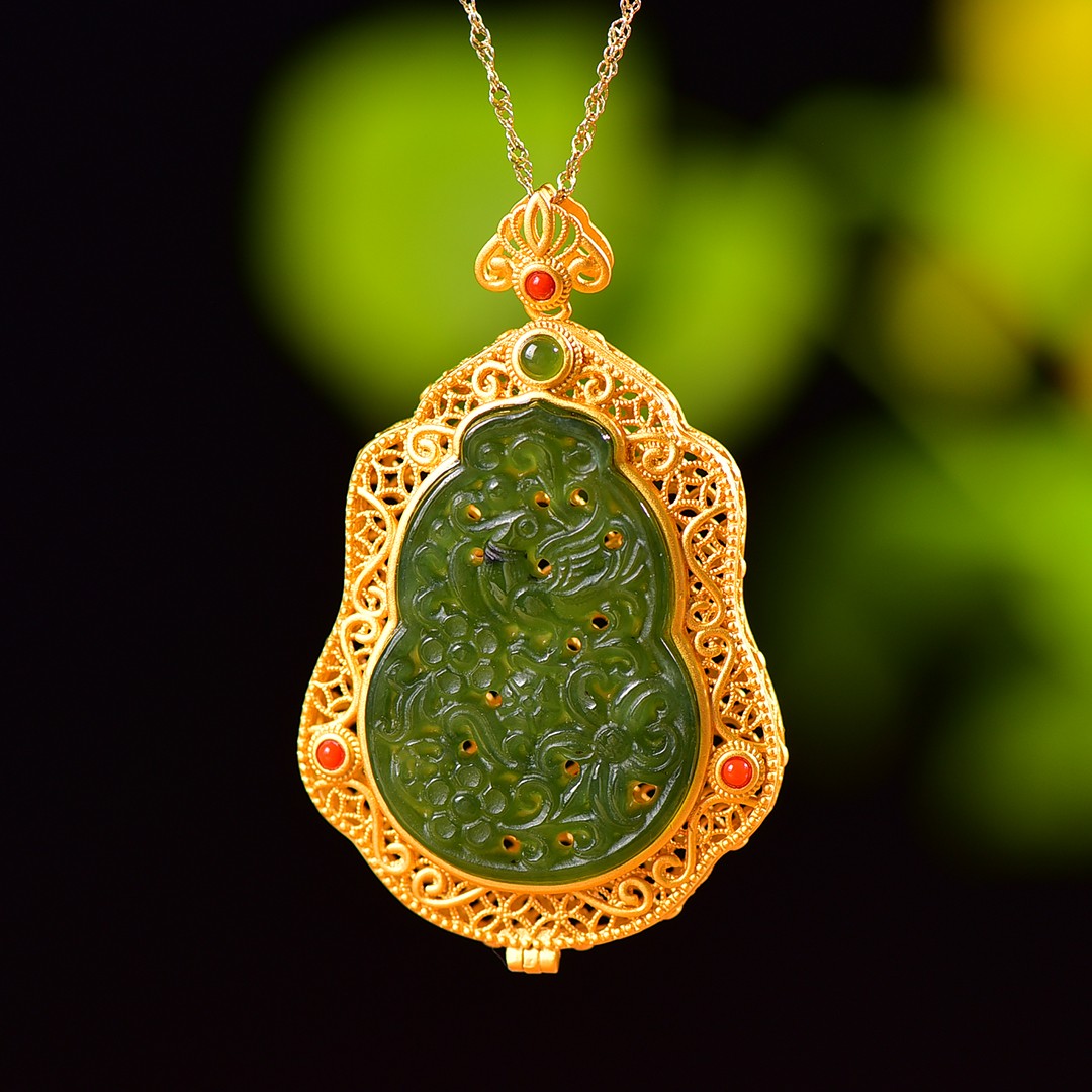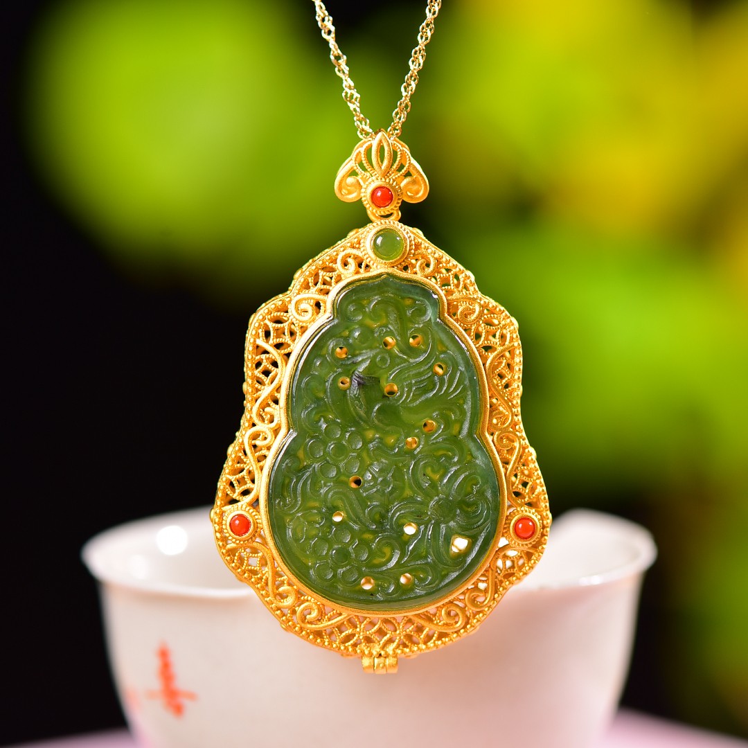 Silver gilt inlaid with jasper hollow and multi-treasure sachet pendant, jade size: 35mmx24mm        银鎏金镶嵌碧玉镂空配多宝香囊吊坠,玉石尺寸:35mmx24mm